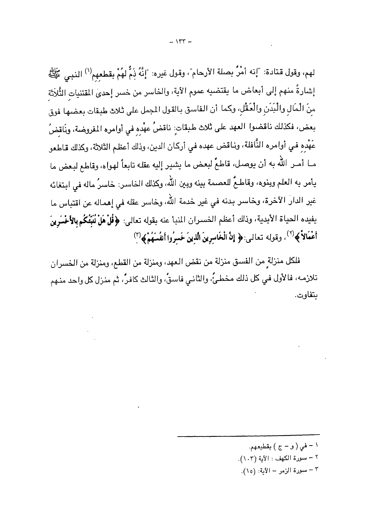 لهم، وقول قتادة: " إنه أمر بصلة الأرحام "، وقول غيره: " إنه ذم لهم بقطعهم النبي - صلى الله عليه وسلم - إشارة منهم إلى أبعاض ما يقتضيه عموم الآية، والخاسر في خسر إحدى المقتنيات الثلاثة من المال والبدن والعقل، وكما أن الفاسق بالقول المجمل على ثلاث طبقات بعضها فوق بعض، فكذلك ناقضوا العهد على ثلاث طبقات: ناقض عهده في أوامره المفروضة، وناقض عهده في أوامر النافلة، وناقض عهده في أركان الدين، وذلك أعظم الثلاثة، وكذلك قاطعو ما أمر الله به أن يوصل، قاطع لبعض ما يشير إليه عقله تابعاً لهواه، وقاطع لبعض ما يأمر به العلم وبنوه، وقاطع للعصمة بينه وبين الله، وكذلك الخاسر: خاسر ماله في ابتغائه غير الدار الآخرة، وخاسر بدنه في غير خدمة الله، وخاسر عقله في إهماله عن اقتباس ما يفيده الحياة الأبدية، وذلك أعظم الخسران المنبأ عنه بقوله تعالى: {قُلْ هَلْ نُنَبِّئُكُمْ بِالْأَخْسَرِينَ أَعْمَالًا} وقوله تعالى: {إِنَّ الْخَاسِرِينَ الَّذِينَ خَسِرُوا أَنْفُسَهُمْ}.