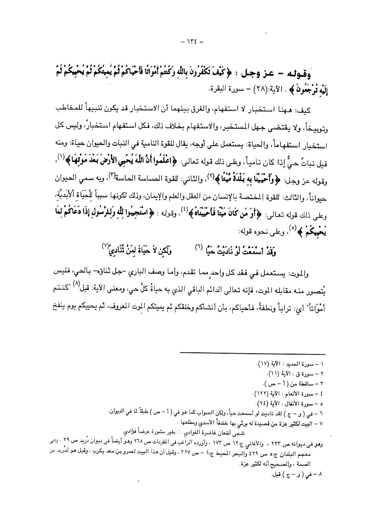 كيف: ههنا استخبار لا استفهام، والفرق بينهما أن الاستخبار قد يكون تنبيهاً للمخاطب وتوبيخاً ولا يقتضي جهل المستخبر، والاستفهام بخلاف ذلك، فكل استفهام استخبار، وليس كل استخبار استفهاماً، والحياة: يستعمل على أوجه، يقال للقوة النامية في النبات والحيوان حياة: ومنه قيل نبات حي إذا كان نامياً، وعلى ذلك قوله تعالى: {اعْلَمُوا أَنَّ اللَّهَ يُحْيِي الْأَرْضَ بَعْدَ مَوْتِهَا} وقوله عز وجل: {وَأَحْيَيْنَا بِهِ بَلْدَةً مَيْتًا} والثاني: للقوة الحساسة الحاسة، وبه سمي الحيوان حيواناً، والثالث: للقوة المختصة بالإنسان من العقل والعلم والإيمان، وذلك لكونها سبباً للحياة الأبدية، وعلى ذلك قوله تعالى: {أَوَمَنْ كَانَ مَيْتًا} وقوله: {اسْتَجِيبُوا لِلَّهِ وَلِلرَّسُولِ إِذَا دَعَاكُمْ لِمَا يُحْيِيكُمْ} وعلى نحوه قوله: