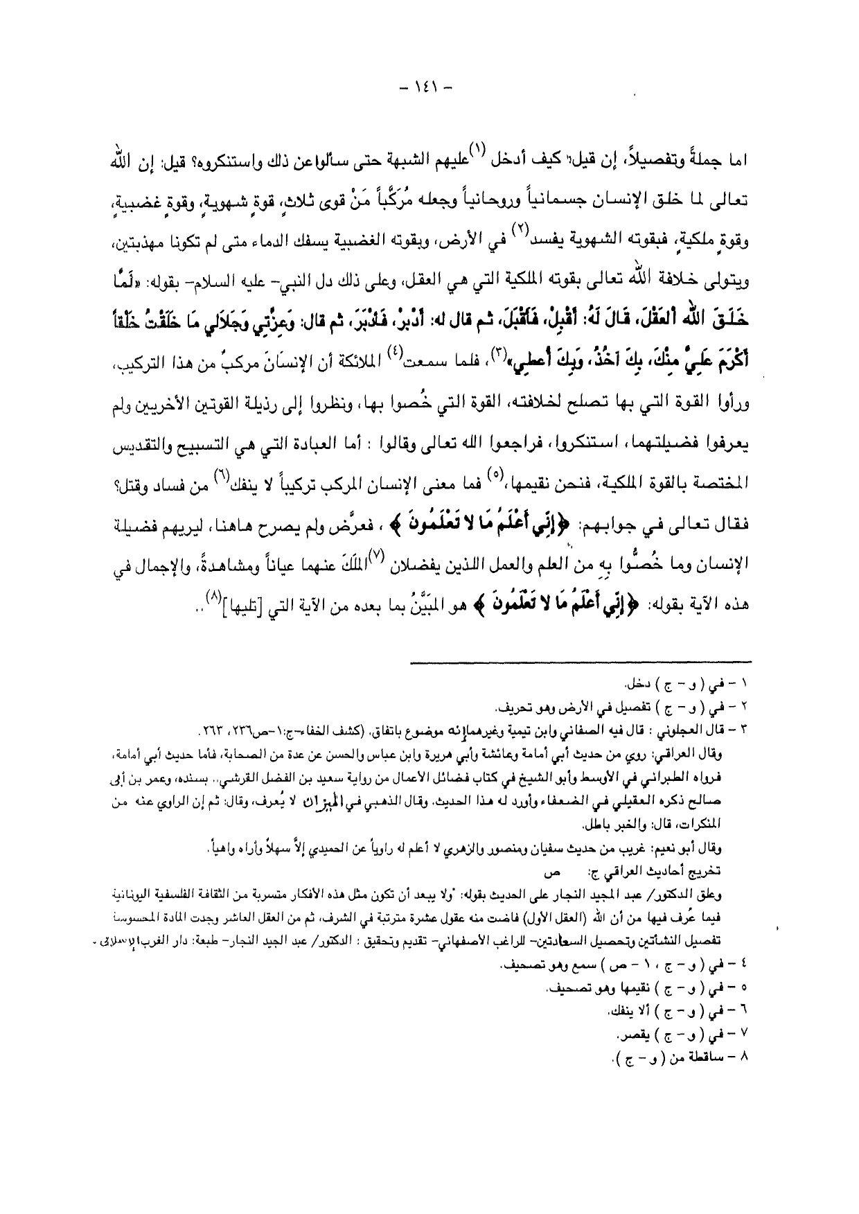 أما جملة وتفصيلاً، إن قيل كيف أدخل عليهم الشبهة حتى سألوا عن ذلك واستنكروه؟ قيل: إن الله تعالى لما خلق الإنسان جسمانياً وروحانياً وجعله مركباً من قوى ثلاث، قوة شهوية، وقوة غضبية وقوة ملكية فبقوته الشهوية يفسد في الأرض، وبقوته الغضبية يسفك الدماء متى لم تكونا مهذبتين ويتولى خلافة الله تعالى بقوته الملكية التي هي العقل، وعلى ذلك دل النبي - عليه السلام - بقوله " لما خلق الله العقل، قال له: أقبل، فأقبل، ثم قال له: أدبر، فأدبر، ثم قال: وعزتي وجلالي ما خلقت خلقا أكرم علي منك، بك أخذ، وبك أعطي "، فلما سمعت الملائكة أن الإنسان مركب من هذا التركيب ورأوا القوة التي بها تصلح لخلافته القوة التي خصوا بها ونظروا إلى رذيلة القوتين الأخريين ولم يعرفوا فضيلتهما استنكروا فراجعوا الله تعالى وقالوا: أما العبادة التي هي التسبيح والتقديس المختصة بالقوة الملكية، فنحن نقيمها، فما معنى الإنسان المركب تركيباً لا ينفك من فساد وقتل؟ فقال تعالى في جوابهم: {إِنِّي أَعْلَمُ مَا لَا تَعْلَمُونَ} فعرض ولم يصرح ها هنا ليريهم فضيلة الإنسان وما خصوا به من العلم والعمل اللذين يفضلان الملك عنهما عياناً ومشاهدة والإجمال في هذه الآية بقوله: {إِنِّي أَعْلَمُ مَا لَا تَعْلَمُونَ} هم المبين بما بعده من الآية التي [تليها] ..
