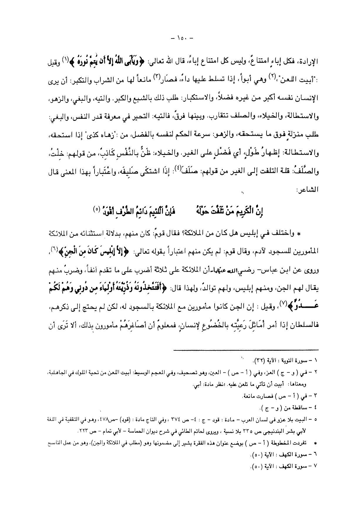 الإرادة، فكل إباء امتناع، وليس كل امتناع إباء، قال الله تعالى: {وَيَأْبَى اللَّهُ إِلَّا أَنْ يُتِمَّ نُورَهُ} وقيل: " أبيت اللعن "، وهي أبوأ، إذا تسلط عليها داء، فصار مانعاً لها من الشراب والتكبر: أن يرى الإنسان نفسه أكبر من غيره فضلاً، والاستكبار: طلب ذلك بالشبع والكبر، والتيه، والبغي، والزهو، والاستطالة، والخيلاء، والصلف تتقارب، وبينها فرق، فالتيه: التحير في معرفة قدر النفس، والبغي: طلب منزلة فوق ما يستحقه، والزهو: سرعة الحكم لنفسه بالفضل، من: " زهاه كذى " إذا استحقه، والاستطالة: إظهار طول، أي فضل على الغير.