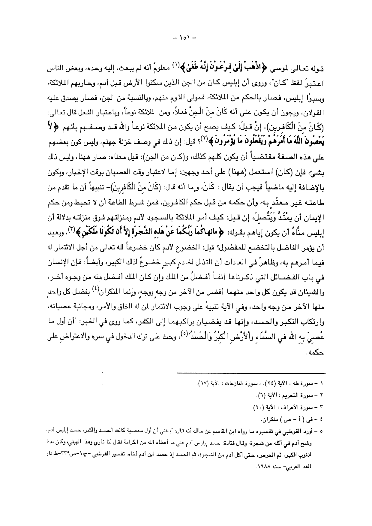 قوله تعالى لموسى {اذْهَبْ إِلَى فِرْعَوْنَ إِنَّهُ طَغَى} معلوم أنه لم يبعث، إليه وحده، وبعض الناس اعتبر لفظ " كان "، وروي أن إبليس كان من الجن الذين سكنوا الأرض قبل آدم، وحاربهم الملائكة، وسبوا إبليس، فصار بالحكم من الملائكة، فمولى القوم منهم، وبالنسبة من الجن، فصار بصدق عليه القولان، ويجوز أن يكون عنى أنه كان من الجن فعلاً، ومن الملائكة نوعاً، وباعتبار الفعل قال تعالى: {كَانَ مِنَ الْكَافِرِينَ}