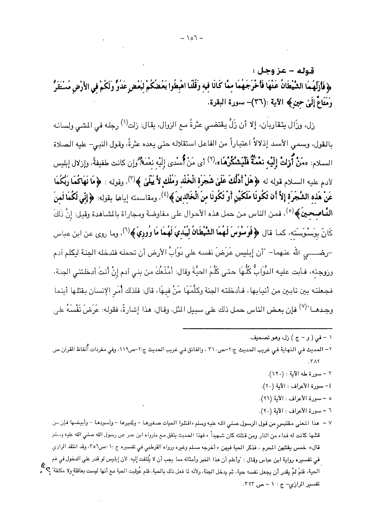 زل، وزال يتقاربان، إلا أن زل يقتضي عثرة مع الزوال، يقال: زلت رجله في المشي ولسانه بالقول، وسمي الأسد إذلالاً اعتباراً من الفاعل استقلاله حتى يعده عثرة، وقول النبي - عليه الصلاة والسلام: " من أزلت إليه نعمة فليشكرها " أي من أسدى إليه نعمه، وإن كانت طفيفة، وإزلال إبليس لآدم عليه السلام قوله له {هَلْ أَدُلُّكَ عَلَى شَجَرَةِ الْخُلْدِ وَمُلْكٍ لَا يَبْلَى} وقوله: {مَا نَهَاكُمَا رَبُّكُمَا عَنْ هَذِهِ الشَّجَرَةِ إِلَّا أَنْ تَكُونَا مَلَكَيْنِ أَوْ تَكُونَا مِنَ الْخَالِدِينَ} ومقاسمته إياها بقوله: {إِنِّي لَكُمَا لَمِنَ النَّاصِحِينَ} فمن الناس من حمل هذه الأحوال على مفاوضة ومجاراة بالمشاهدة وقيل: إن ذلك كان بوسوسته كما قال: {فَوَسْوَسَ لَهُمَا الشَّيْطَانُ لِيُبْدِيَ لَهُمَا مَا وُورِيَ} وما روى عن ابن عباس - رضي الله عنهما - أن إبليس عرض نفسه على دواب الأرض أن تحمله فتدخله الجنة ليكلم آدم وزوجته، فأبت عليه الدواب كلها حتى كلم الحية وقال: أمنعك من بني آدم إن أنت أدخلتني الجنة، فجعلته بين نابين من أنيابها، فأدخلته الجنة وكلمها من فيها، قال: فلذلك أمر الإنسان بقتلها أينما وجدها فإن بعض الناس حمل ذلك على سبيل المثل، وقال: هذا إشارة، فقوله: عرض نفسه على