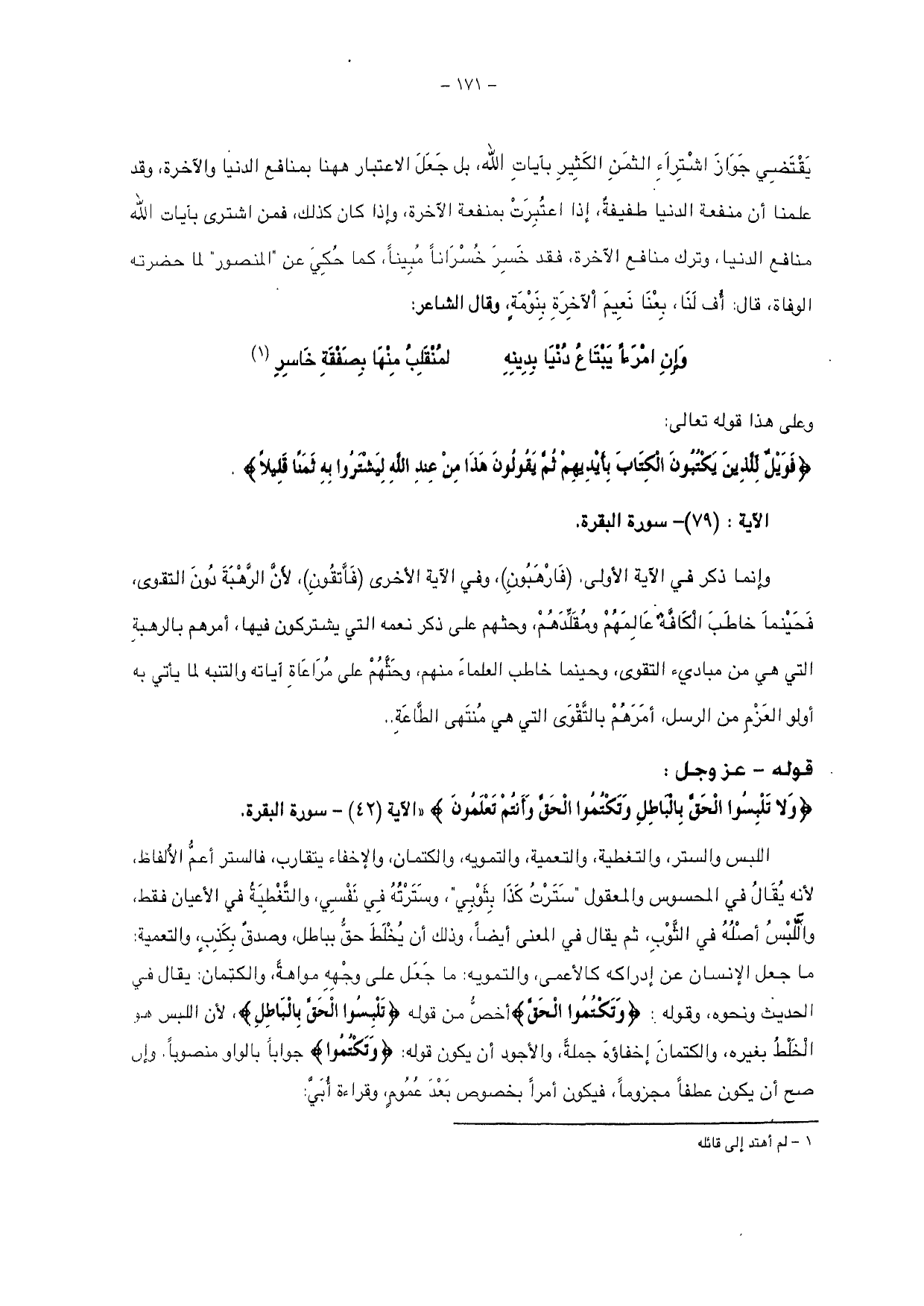 يقتضي جواز اشتراء الثمن الكثير بآيات الله، بل جعل الاعتبار ههنا بمنافع الدنيا والآخرة، وقد علمنا أن منفعة الدنيا طفيفة، إذا اعتبرت بمنفعة الآخرة، وإذا كان كذلك، فمن اشترى بآيات الله منافع الدنيا، وترك منافع الآخرة، فقد خسر خسراناً مبيناً، كما حكي عن " المنصور " لما حضرته الوفاة: قال: أف لنا، بعنا نعيم الآخرة بنومة، وقال الشاعر: