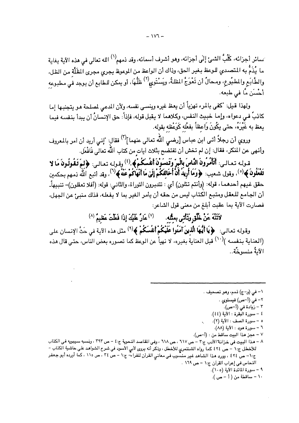 قوله تعالى: {أَتَأْمُرُونَ النَّاسَ بِالْبِرِّ وَتَنْسَوْنَ أَنْفُسَكُمْ}، وقوله تعالى: {لِمَ تَقُولُونَ مَا لَا تَفْعَلُونَ}، وقول شعيب: {وَمَا أُرِيدُ أَنْ أُخَالِفَكُمْ إِلَى مَا أَنْهَاكُمْ عَنْهُ}، وقد اتبع الله ذمهم بحكمين حقق غيهم أحدهما، قوله: {وانتم تتلون) أي: تتدبرون التوراة، والثاني: قوله: (أفلا تعلقون) - تنبيهاً - أن الجامع للعقل ومتبع الكتاب ليس من حقه أن يأمر الغير بما لا يفعله، فذلك منبئ عن الجهل، فصارت الآية بما عقبت أبلغ من معنى قول الشاعر: