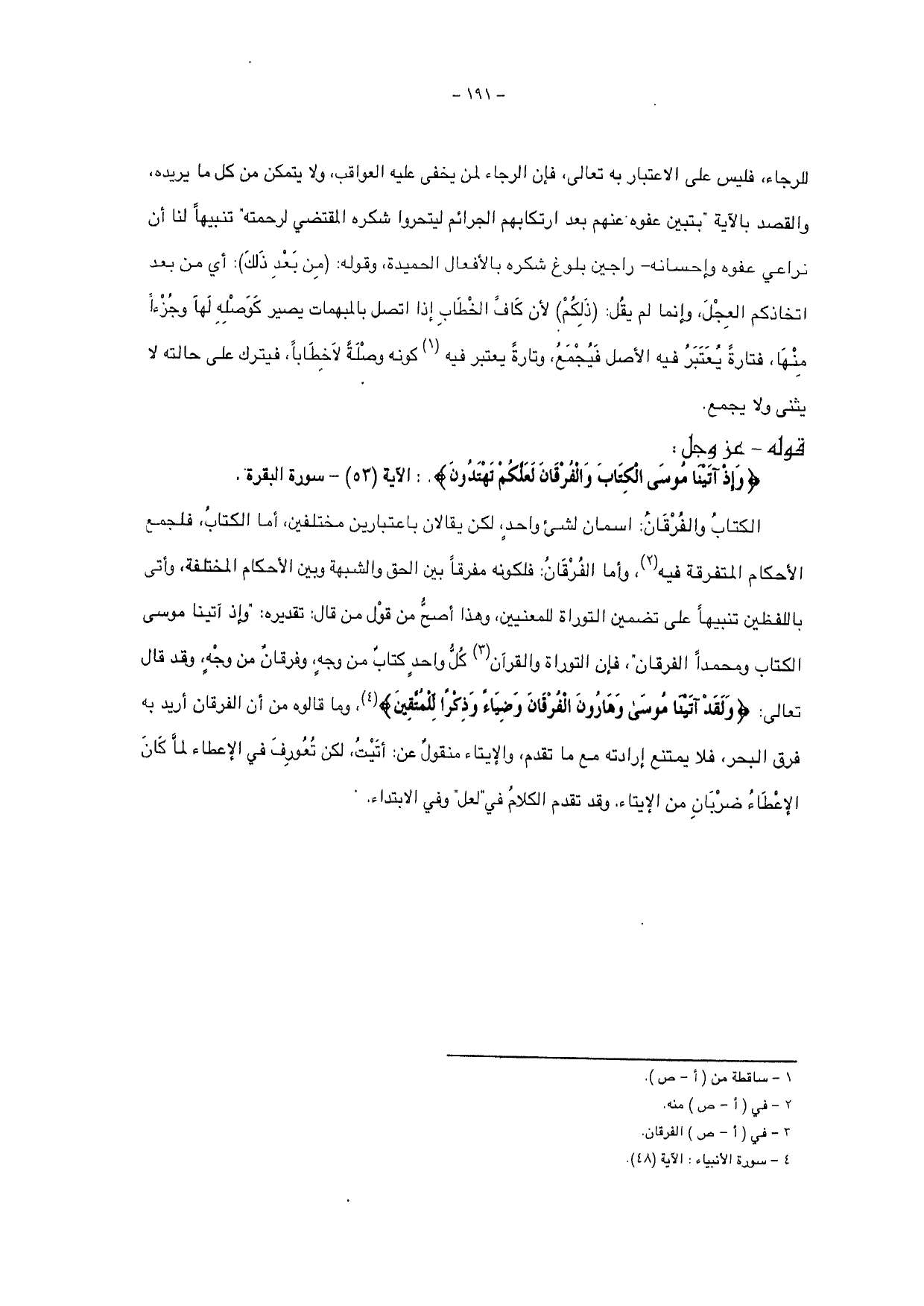 الكتاب والفرقان: اسمان لشيء واحدٍ لكن يقالان باعتبارين مختلفين أما الكتاب، فلجمع الأحكام المتفرقة فيه، وأما الفرقان: فلكونه مفرقاً بين الحق والشبهة وبين الأحكام المختلفة، وأتى باللفظين تنبيهاً على تضمين التوراة للمعنيين وهذا أصح من قول من قال: تقديره: " وإذ آتينا موسى الكتاب ومحمداً الفرقان " فغن التوراة والقرآن كل واحدٍ كتاب من وجهٍ، وفرقان من وجه، وقد قال تعالى: {وَلَقَدْ آتَيْنَا مُوسَى وَهَارُونَ الْفُرْقَانَ وَضِيَاءً وَذِكْرًا لِلْمُتَّقِينَ} وما قالوه من أن الفرقان أريد به فرق البحر فلا يمتنع إرادته مع ما تقدم، والإيتاء منقول عن: أتيت لكن تعورف في الإعطاء لما كان الإعطاء ضربان من الإيتاء وقد تقدم الكلام في " لعل " وفي الابتداء.