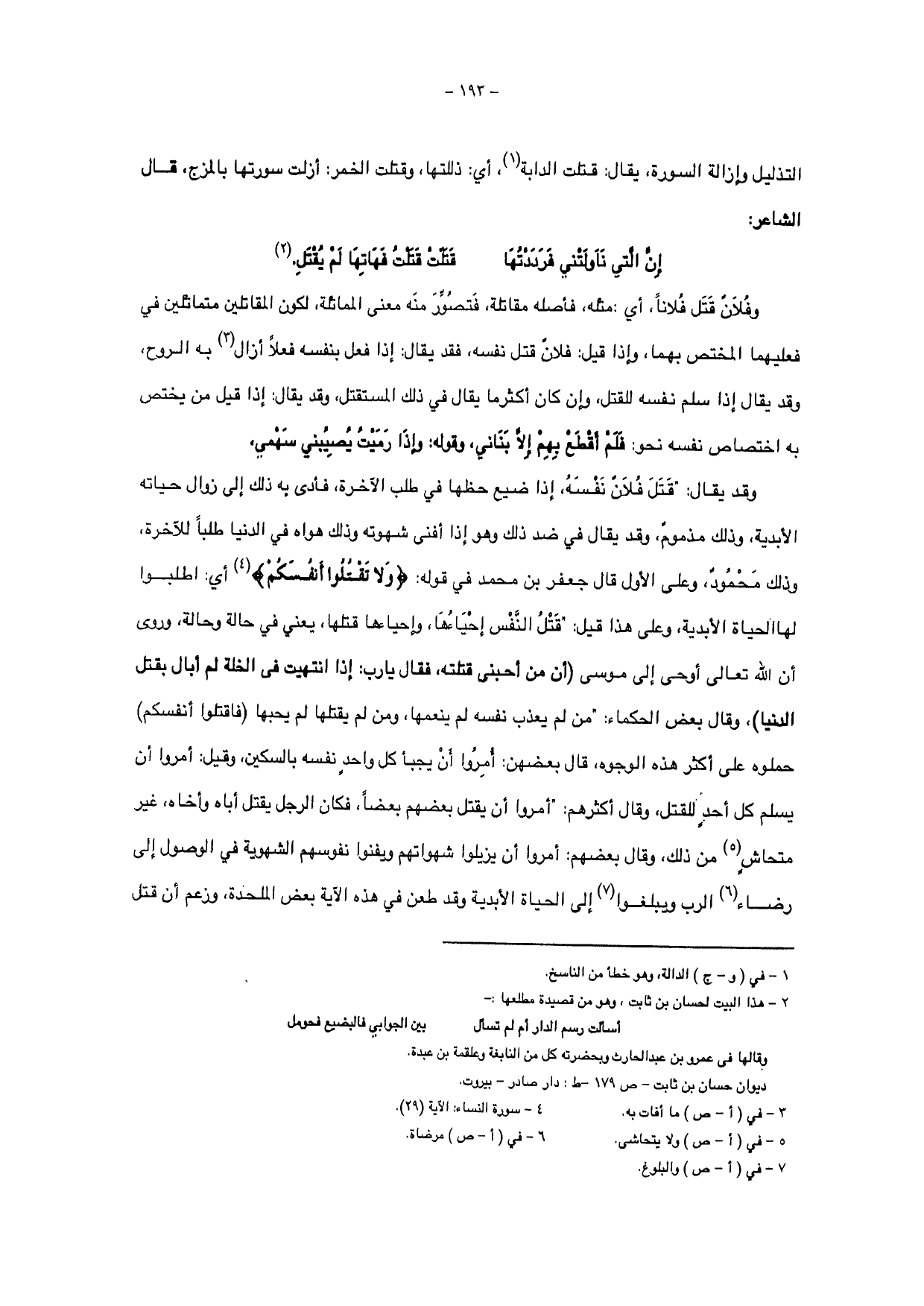 وفلان قتل فلاناً، أي: مثله، فأصله مقاتلة، فتصور منه معنى المماثلة، لكون المقاتلين متماثلين في فعليهما المختص بهما، وإذ قيل: فلان قتل نفسه، فقد يقال: إذا فعل بنفسه فعلاً أزال به الروح، وقد يقال إذ سلم نفسه للقتل، وإن كان أكثر ما يقال في ذلك المستقتل وقد يقال: إذ قيل من يختص به اختصاص نفسه نحو: فلم أقطع بهم إلا بنائي، وقوله: وإذا رميت يصيبني سهمي