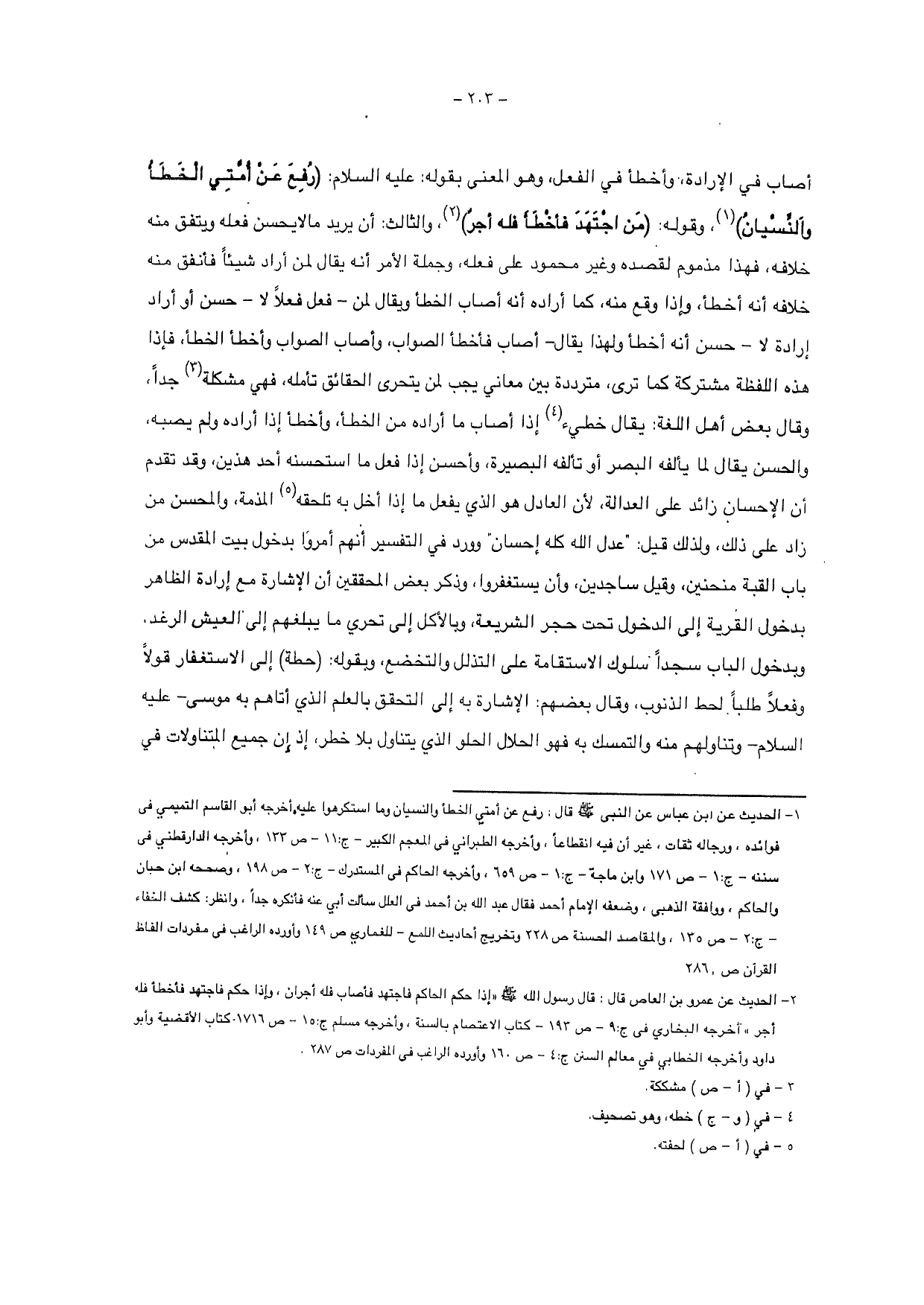 أصاب في الإرادة، وأخطأ في الفعل، وهو المعنى بقوله: عليه السلام: (رفع عن أمتي الخطأ والنسيان)، وقوله: (من اجتهد فأخطأ فله أجر)، والثالث: أن يريد ما لا يحسن فعله ويتفق منه خلافه، فهذا مذموم لقصده وغير محمود على فعله، وجملة الأمر أنه يقال لمن أراد شيئاً فأنفق منه خلافه أنه أخطأ، وإذا وقع منه، كما أراده أنه اصاب الخطأ ويقال لمن - فعل فعلاً لا - حسن أو أراد إرادة لا - حسن أنه أخطأ ولهذا يقال - أصاب فأخطأ الصواب، وأصاب الصواب وأخطأ الخطأ، فإذا هذه اللفظة مشتركة كما ترى، مترددة بين معاني يجب لمن يتحرى الحقائق تأمله، فهي مشكلة جداً، وقال بعض أهل اللغة: يقال خطئ إذا أصاب ما أراده من الخطأ، وأخطأ إذا أراده ولم يصبه، والحسن سقال لما يألفه البصر أو تألفه البصيرة، وأحسن إذا فعل ما استحسنه أحد هذين، وقد تقدم أن الإحسان زائد على العدالة، لأن العادل هو الذ يفعل ما إذا أخل به تلحقه المذمة، والمحسن من زاد على ذلك، ولذلك قيل: " عدل الله كله إحسان " وورد في التفسير أنهم أمروا بدخول بيت المقدس من باب القبة منحنين، وقيل ساجدين، وأن يستغفروا، وذكر بعض المحققين أن الإشارة مع إرادة الظاهر بدخول القرية إلى الدخول تحت حجر الشريعة، وبالأكل إلى تحري ما يبلغهم إلى العيش الرغد.