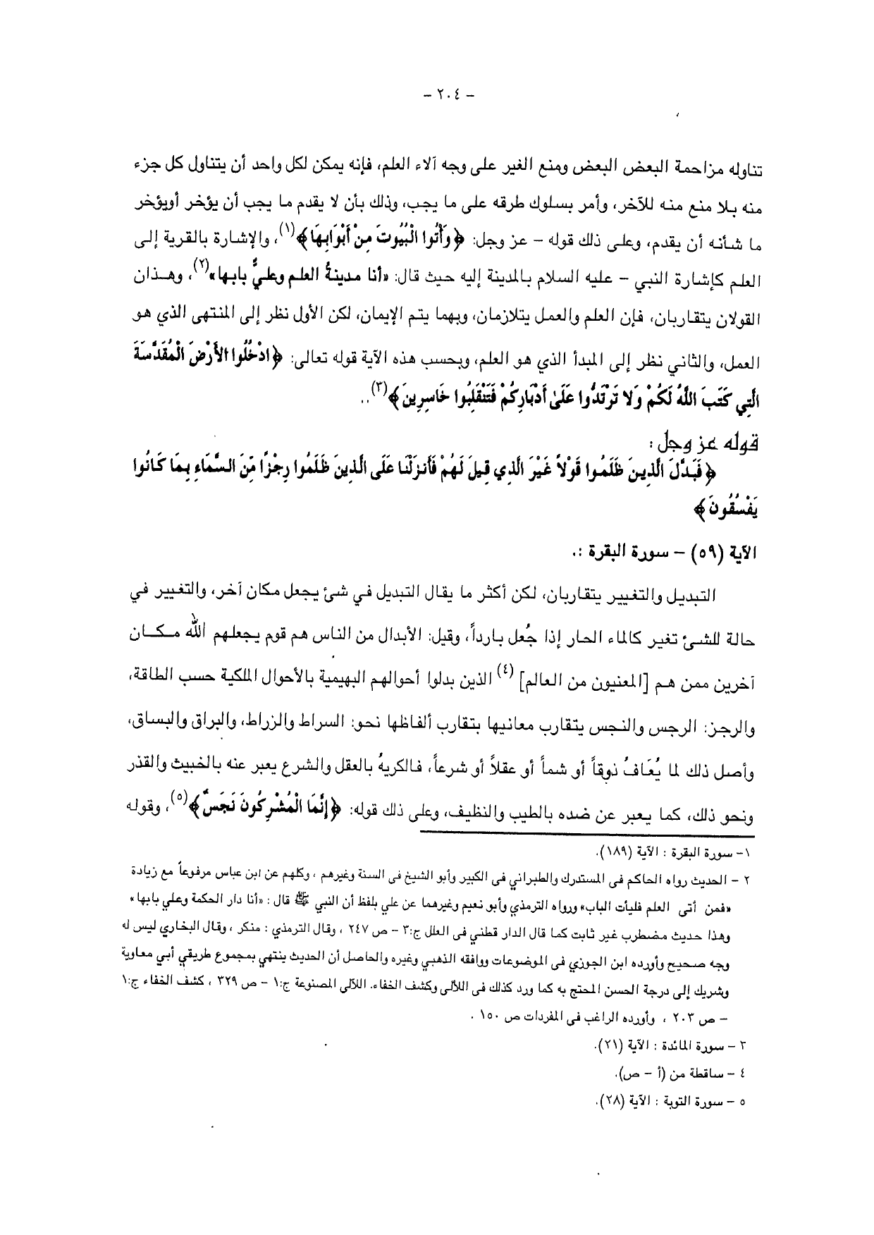 تناوله مزاحمة البعض بعض ومنع الغير على وجه آلاء العلم، فإنه يمكن لكل واحد أن يتناول كل جزء منه بلا منع منه للآخر، وأمر بسلوك طرقه على ما يجب، وذلك بأن لا يقدم ما يجب أن يؤخر أو يؤخر ما شأنه أن يقدم، وعلى ذلك قوله - عز وجل -: {وَأْتُوا الْبُيُوتَ مِنْ أَبْوَابِهَا}، والإشارة بالقرية إلى العلم كإشارة النبي - عليه السلام بالمدينة إليه حيث قال: " أنا مدينةُ العلم وعليَّ بابها "، وهذان القولان يتقاربان، فإن العلم والعمل يتلازمان، وبهما يتم الإيمان، لكن الأول نظر إلى المنتهى الذي هو العمل، والثاني نظر إلى المبدأ الذي هو العلم، وبحسب هذه الآية قوله تعالى: {ادْخُلُوا الْأَرْضَ الْمُقَدَّسَةَ الَّتِي كَتَبَ اللَّهُ لَكُمْ وَلَا تَرْتَدُّوا عَلَى أَدْبَارِكُمْ فَتَنْقَلِبُوا خَاسِرِينَ} ..