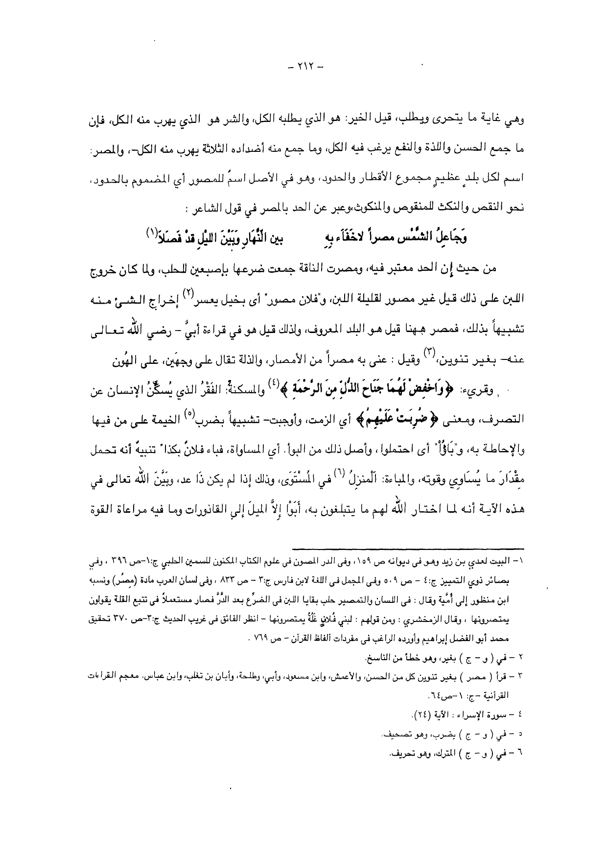 وهي غاية ما يتحرى ويطلب، قيل الخير: هو الذي يطلبه الكل، والشر هو الذي يهرب منه الكل، فإن ما جمع الحسن واللذة والنفع يرغب فيه الكل، وما جمع منه أضداده الثلاثة يهرب منه الكل، والمصر: اسم لكل بلد عظيم مجموع الأقطار والحدود، وهو في الأصل اسم للمصور أي المضموم بالحدود نحو النقص والنكث للمنقوص والمنكوث، وعبر عن الحد بالمصر في قول الشاعر: