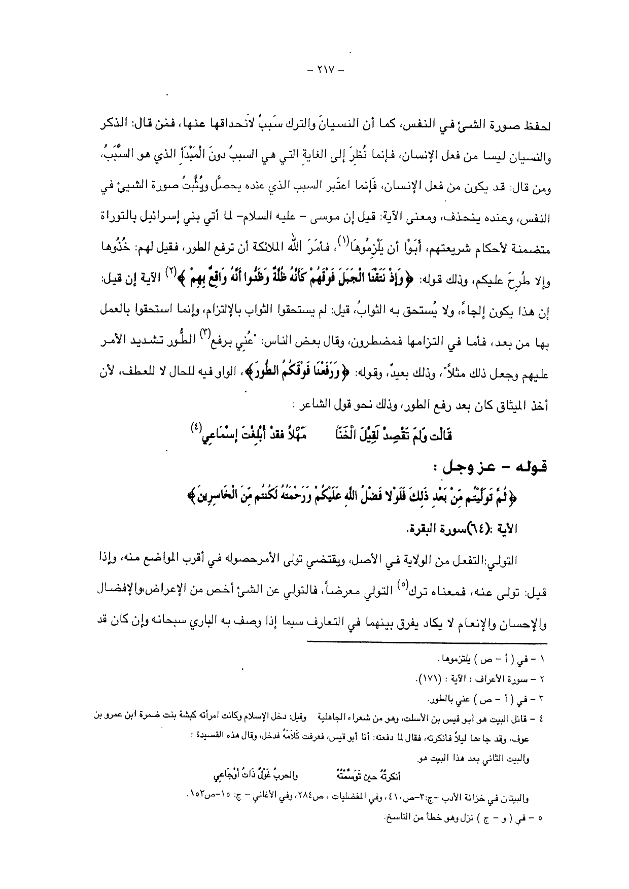 لحفظ صورة الشيء في النفس، كما أن النسيان والترك سبب لانحداقها عنها، فمن قال: الذكر والنسيان ليسا من فعل الإنسان، فإنما نظر إلى الغاية التي هي السبب دون المبدأ الذي هو السبب ومن قال " قد يكون من فعل الإنسان، فإنما اعتبر السبب الذي عنده يحصل ويثبت صورة الشيء في النفس، وعنده ينحذف، ومعنى الآية: قلت إن موسى - عليه السلام - لما أتى بني إسرائيل بالتوراة متضمنة لأحكام شريعتهم، أبوا أن يلزموها، فأمر الله الملائكة أن ترفع الطور، فقيل لهم: خذوها وإلا طرح عليكم، وذلك قوله: {وَإِذْ نَتَقْنَا الْجَبَلَ فَوْقَهُمْ كَأَنَّهُ ظُلَّةٌ وَظَنُّوا أَنَّهُ وَاقِعٌ بِهِمْ} الآية