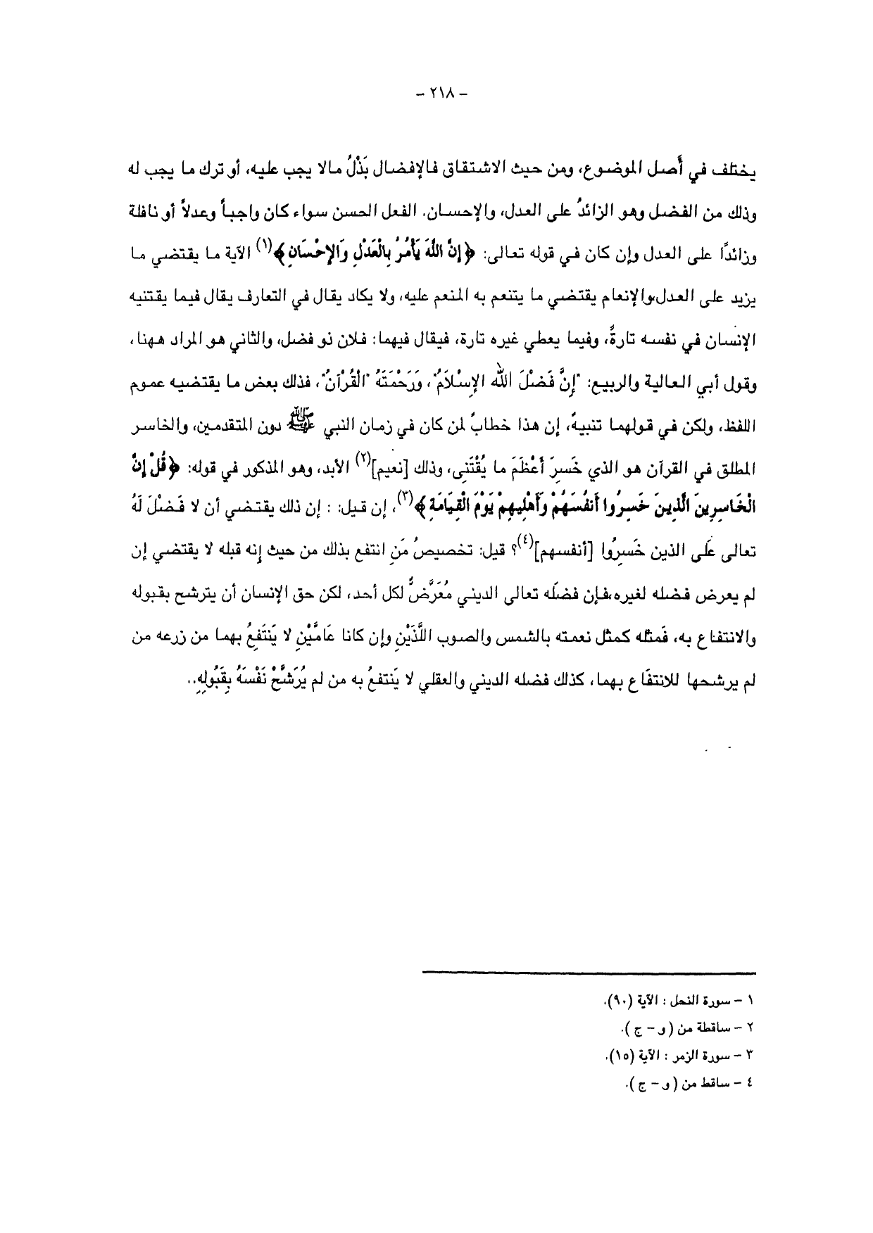 الفعل الحسن سواء كان واجبا وعدلاً أو نافلة وزائدا على العدل وأن كان في قوله تعالى: {إِنَّ اللَّهَ يَأْمُرُ بِالْعَدْلِ وَالْإِحْسَانِ} الآية ما يقتضي ما يزيد على العدل والإنعام يقتضي ما يتنعم به المنعم عليه، ولا يكاد يقال في التعارف يقال فيما يقتنيه الإنسان في نفسه هذه، وفيما يعطي غيره تارة، فيقال فيهما: فلان ذو فضل، والثاني هو المراد ههنا، وقول أبي العالية والربيع: " إن فضل الله الإسلام "، ورحمته " القرآن "، فذلك بعض ما يقتضيه عموم اللفظ، ولكن في قولهما تنميه، إن هذا خطاب لمن كان في زمان النبي - صلى الله عليه وسلم - دون المتقدمين، والخاسر المطلق في القرآن هو الذي خسر أعظم ما يقتني، وذلك [نعيم] الأبد، وهو المذكور في قوله: {قُلْ إِنَّ الْخَاسِرِينَ الَّذِينَ خَسِرُوا أَنْفُسَهُمْ وَأَهْلِيهِمْ يَوْمَ الْقِيَامَةِ}، إن قيد: إن ذلك يقتضي أن لا فضل له تعالى على الذين خسروا [أنفسهم]، قيل: تخصيص من انتفع بذلك من حيث إنه قبله لا يقتضي إن لم يعرض فضله لغيره فإن فضله تعالى الديني معرض لكل أحد، لكن حق الإنسان أن يترشح بقبوله والانتفاع به، فمثله كمثل نعمته بالشمس والصوب اللذين وإن كانا عامين لا ينتفع بهما من زرعه من لم يرشحها للانتفاع بهما، كذلك فضله الديني والعقلي لا ينتفع به من لم يرشح نفسه بقبوله ..