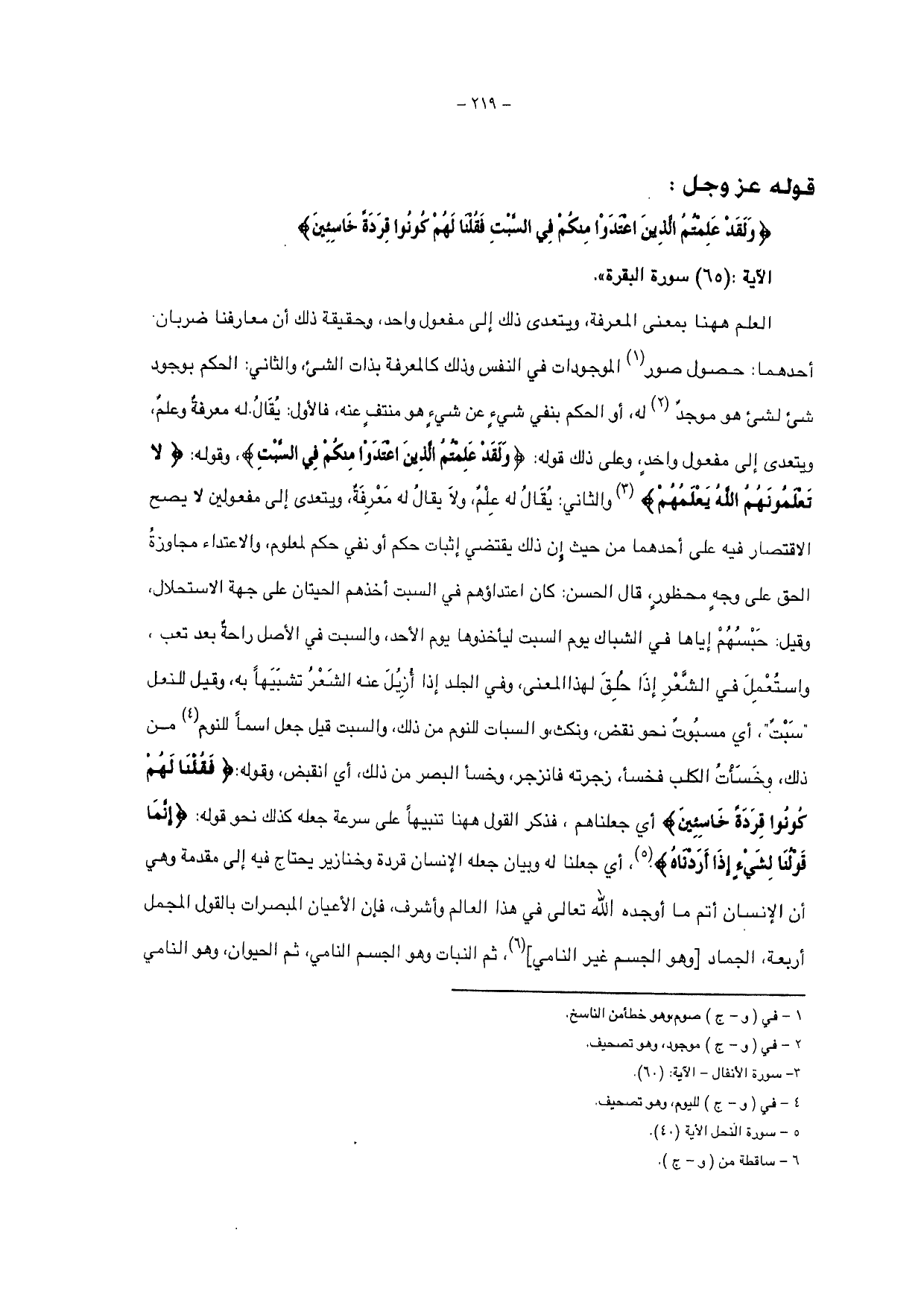 أحدهما: حصول صور الموجودات في النفس وذلك كالمعرفة بذات الشيء، والثاني: الحكم بوجود شيء لشيء هو موجد له، أو الحكم بنفي شيء عن شيء هو منتف عنه، فالأول: يقال له معرفة وعلم، ويتعدى إلى مفعول واحد، وعلى ذلك قوله: {وَلَقَدْ عَلِمْتُمُ الَّذِينَ اعْتَدَوْا مِنْكُمْ فِي السَّبْتِ}، وقوله: {لَا تَعْلَمُونَهُمُ اللَّهُ يَعْلَمُهُمْ} والثاني: يقال له علم، ولا يقال له معرفة، ويتعدى إلى مفعولين لا يصح الاقتصار فيه على أحدهما من حيث إن ذلك يقتضي إثبات حكم أو نفي حكم لمعلوم، والاعتداء مجاوزة الحق على وجه محظور قال الحسن: كان اعتداؤهم في السبت أخذهم الحيتان على جهة الاستحلال وقيل: حبسهم إياها في الشباك يوم السبت ليأخذوها يوم الأحد، والسبت في الأصل راحة بعد تعب، واستعمل في الشعر إذا حلق لهذا المعنى، وفي الجلد إذا أزيل عنه الشعر تشبيها به، وقيل للنعل " سبت "، أي مسبوت نحو نقض، ونكث، والسبات للنوم من ذلك، والسبت قيل جعل اسما للنوم من ذلك، وخسأت الكلب فخسأ، زجرته فانزجر وخسأ البصر من ذلك أي انقبض، وقوله {فَقُلْنَا لَهُمْ كُونُوا قِرَدَةً خَاسِئِينَ} أي جعلناهم، فذكر القول ههنا تنبيها على سرعة جعله كذلك نحو قوله: {إِنَّمَا قَوْلُنَا لِشَيْءٍ إِذَا أَرَدْنَاهُ}، أي جعلنا له وبيان جعله الإنسان قردة وخنازير يحتاج فيه إلى مقدمة وهي أن الإنسان أتم ما أوجده الله تعالى في هذا العالم وأشرف، فإن الأعيان المبصرات بالقول المجمل أربعة، الجماد [وهو الجسم غير النامي]، ثم النبات وهو الجسم النامي، ثم الحيوان، وهو النامي