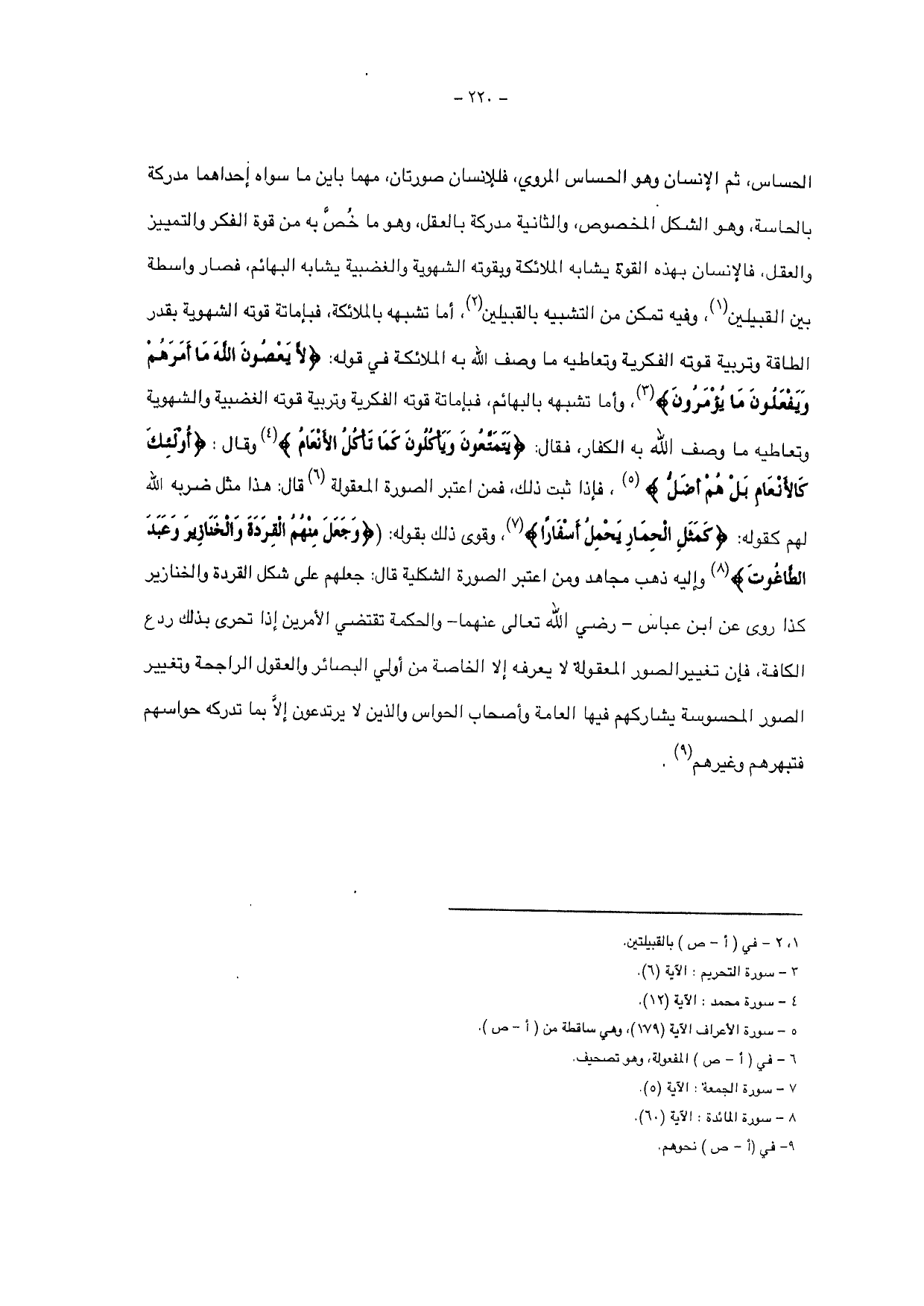 الحساس، ثم الإنسان وهو الحساس المروي، فللإنسان صورتان، مهما باين ما سواه إحداهما مدركة بالحاسة، وهو الشكل المخصوص، والثانية مدركة بالعقل، وهو ما خص به من قوة الفكر والتمييز والعقل، فالإنسان بهذه القوة يشابه الملائكة وبقوته الشهوية والعضبية يشابه البهائم، فصار واسطة بين القبيلين، وفيه تكمن من التشبيه بالقلبيلين، أما تشبيهه بالملائكة، فبإماتامة قوته الشهوية بقدر الطاقة وتربية قوته الفكرية وتعاطيه ما وصف الله به الملائكة في قوله: {لَا يَعْصُونَ اللَّهَ مَا أَمَرَهُمْ وَيَفْعَلُونَ مَا يُؤْمَرُونَ}، وأما تبيهه بالبهائم، فبإماماتق قوته الفكرية وتربية قوته الغضبية والشهوية وتعاطيه ما وصف الله به الكفار، فقال: {يَتَمَتَّعُونَ وَيَأْكُلُونَ كَمَا تَأْكُلُ الْأَنْعَامُ} وقال: {أُولَئِكَ كَالْأَنْعَامِ بَلْ هُمْ أَضَلُّ}، فإذا ثبت ذلك، فمن اعتبر الصورة المعقولة قال: هذا مثل ضربه الله لهم كقوله: {كَمَثَلِ الْحِمَارِ يَحْمِلُ أَسْفَارًا}، وقوى ذلك بقوله: {وَجَعَلَ مِنْهُمُ الْقِرَدَةَ وَالْخَنَازِيرَ وَعَبَدَ الطَّاغُوتَ} وإليه ذهب مجاهد ومن اعتبر الصورة الشكلية قال: جعلهم على شكل القردة والخنازير كذا روى عن ابن عباس - - رضي الله تعالى عنهما - والحكمة تقتضي الأمرين إدا تحرى بذلك ردع الكافة، فإن تغيير الصور المعقوبلة لا يعرفه إلا الخاصة هن أولي البصائر والعقول الراجحة وتغيير الصور الحساسة يشاركهم فيها العامة وأصحاب الحواس والدين لايرتدعون إلاً بما تدركه حواسهم فتبهرهم وغيرهم.
