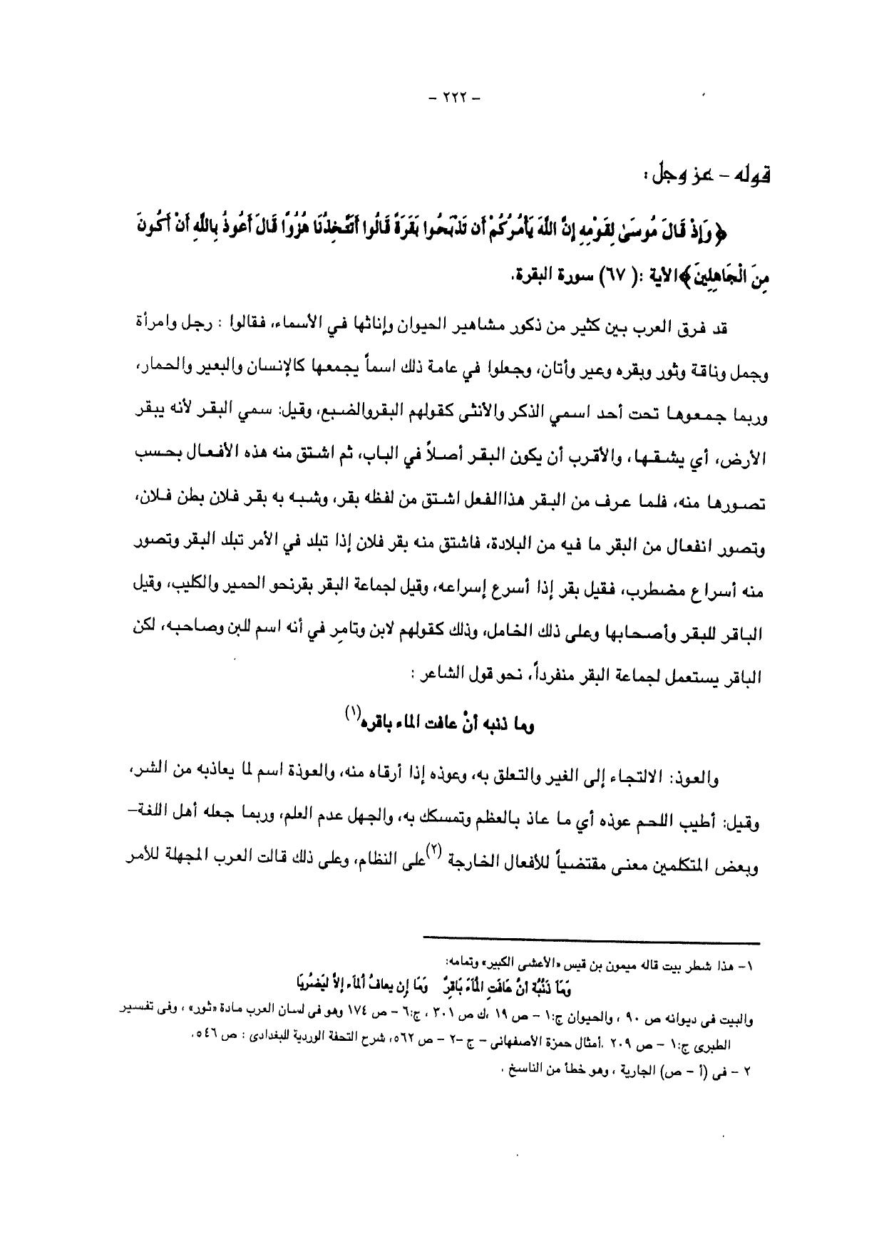 قد فرق العرب بين كثير من ذكور مشاهير الحيوان وإناثها في الأسماء فقالوا: رجل وامرأة وجمل وناقة وثور وبقره وعير وأتان، وجعلوا في عامة ذلك اسما يجمعها كالإنسان والبعير والحمار وربما جمعوها تحت أحد اسمي الذكر والأنثى كقولهم البقر والضبع وقيل: سمي البقر لأنه يبقر الأرض، أي يشقها، والأقرب أن يكون البقر أصلاً في الباب، ثم اشتق منه هذه الأفعال بحسب تصورها منه، فلما عرف من البقر هذا الفعل اشتق من لفظه بقر، وشبه به بقر فلان بطن فلان، وتصور انفعال من البقر ما فيه من البلادة، فاشتق منه بقر فلان إذا تبلد في الأمر تبلد البقر وتصور منه أسرار مضطرب، فقيل بقر إذا أسرع إسراعه، وقيل لجماعة البقر بقرنحو الحمير والكلاب، وقيل الباقر للبقر وأصحابها وعلى ذلك الخامل، وذلك كقولهم لابن وتامر في أنه اسم للبن وصاحبه لكن الباقر يستعمل لجماعة البقر منفردا، نحو قول الشاعر: