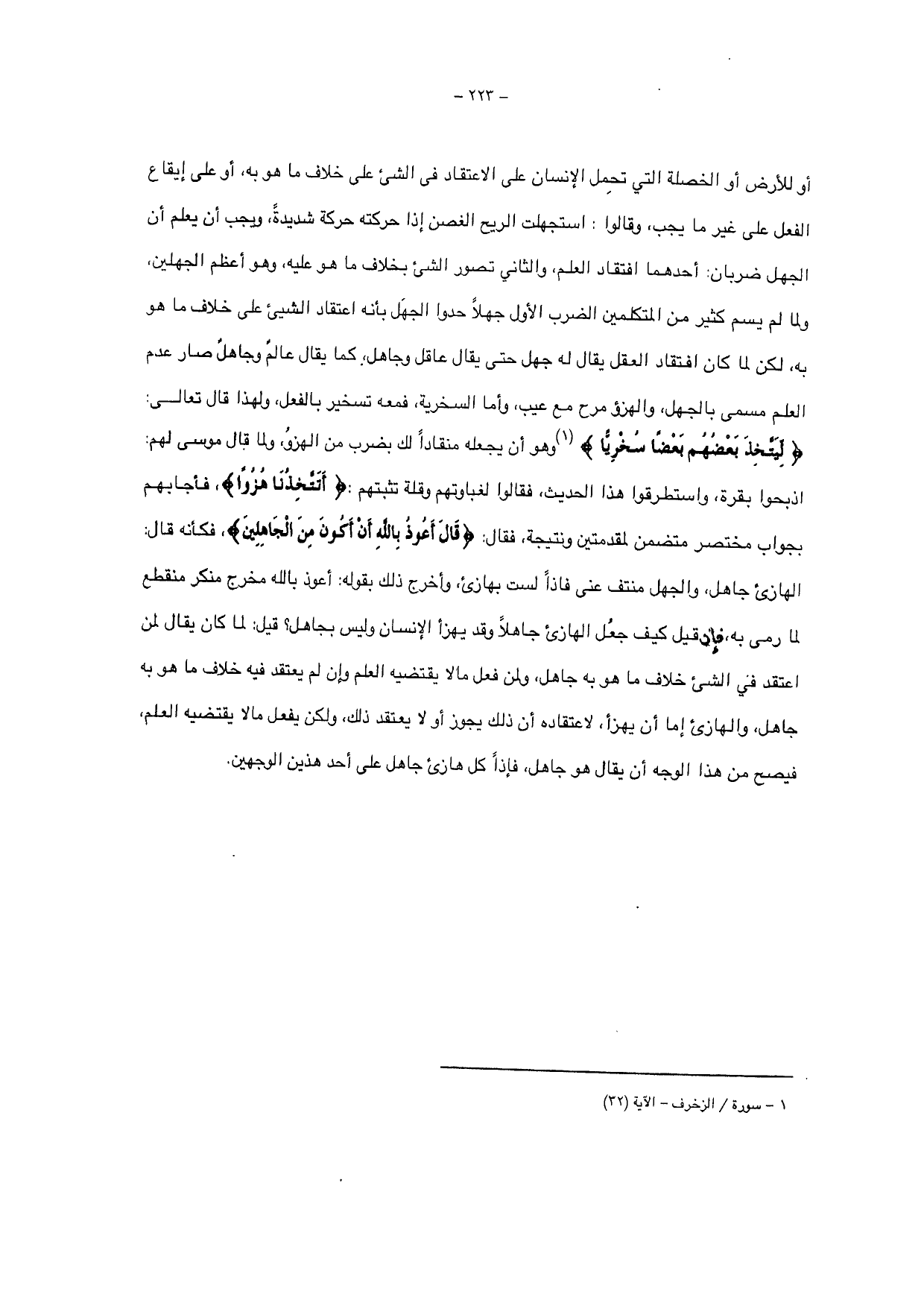 أو للأرض أو الخصلة التي تحمل الإنسان على الاعتقاد في الشيء على خلاف ما هو به، أو على إيقاع الفعل على غير ما يجب، وقالوا: استجهلت الريح الغصن إذا حركته حركة شديدة، ويجب أن يعلم أن الجهل ضربان: أحدهما افتقاد العلم، والثاني تصور الشيء بخلاف ما هو عليه، وهو أعظم الجهلين، ولما لم يسم كثير من المتكلمين الضرب الأول جهلاً حدوا الجهل بأنه اعتقاد الشيء على خلاف ما هو به، لكن لا كان افتقاد العقل يقال له جهل حتى يقال عاقل وجاهل، كما يقال عالم وجاهل صار عدم العلم مسمى بالجهل، والهزؤ مرح مع عيب وأما السخرية، فمعه تسخير بالفعل، ولهذا قال تعالى: {لِيَتَّخِذَ بَعْضُهُمْ بَعْضًا سُخْرِيًّا} وهو أن يجعله منقادا لك بضرب من الهزو، ولما قال موسى لهم: اذبحوا بقرة، واستطرقوا هذا الحديث، فقالوا لغباوتهم وقلة تثبتهم: {أَتَتَّخِذُنَا هُزُوًا}، فأجابهم بجواب مختصر متضمن لمقدمتين ونتيجة، فقال، {قَالَ أَعُوذُ بِاللَّهِ أَنْ أَكُونَ مِنَ الْجَاهِلِينَ} فكأنه قال: الهازئ جاهل، والجهل منتف عنى فإذا لست بهازئ، وأخرج ذلك بقوله: أعوذ بالله مخرج منكر منقطع لما رمى به، فإن قيل كيف جعل الهازئ جاهلاً وقد يهزأ الإنسان وليس بجاهل؟ قيل: لما كان يقال لمن اعتقد قي الشيء خلاف ما هو به جاهل، ولمن فعل مالا يقتضيه العلم وإن لم يعتقد فيه خلاف ما هو به جاهل، والهازئ إما أن يهزأ، لاعتقاده أن ذلك يجوز أو لا يعتقد ذلك، ولكن يفعل مالا يقتضيه العلم، فيصح من هذا الوجه أن يقال هو جاهل، فإذا كل هازئ جاهل على أحد هذيان الوجهين.