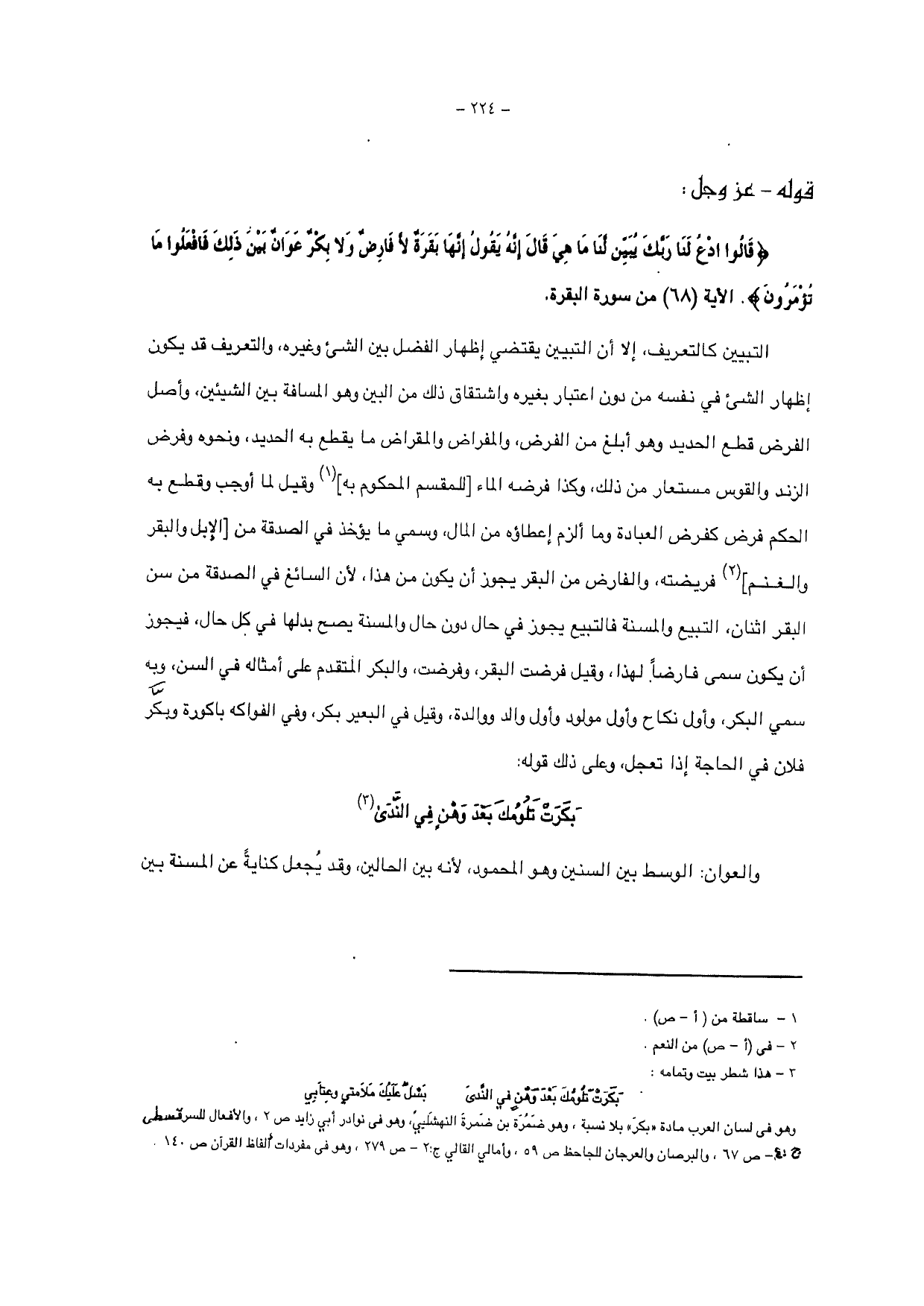 {قَالُوا ادْعُ لَنَا رَبَّكَ يُبَيِّنْ لَنَا مَا هِيَ قَالَ إِنَّهُ يَقُولُ إِنَّهَا بَقَرَةٌ لَا فَارِضٌ وَلَا بِكْرٌ عَوَانٌ بَيْنَ ذَلِكَ فَافْعَلُوا مَا تُؤْمَرُونَ} الآية (68) من سورة البقرة.