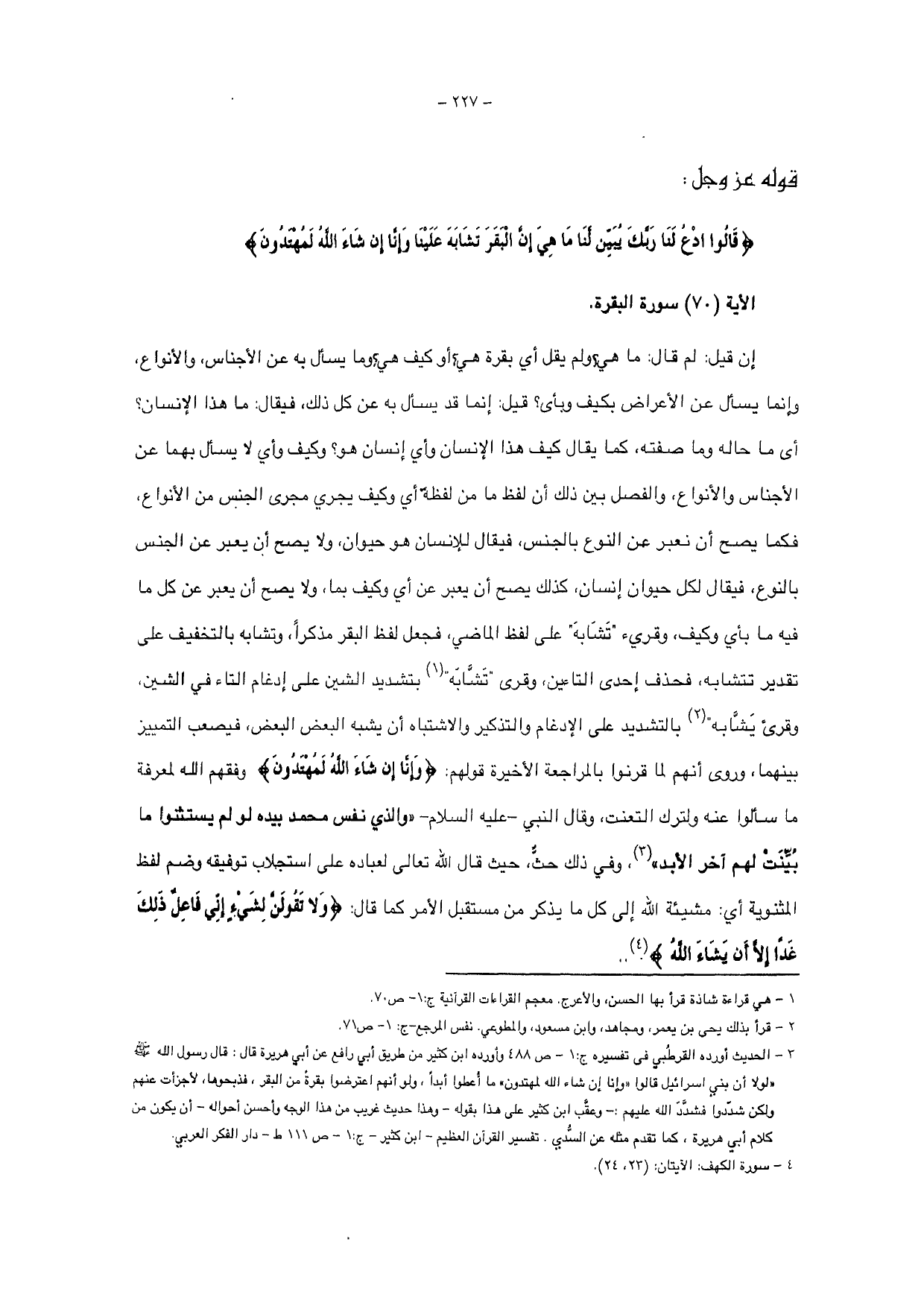 بالنوع، فيقال لكل حيوان إنسان، كذلك يصح أن يعبر عن أي وكيف بما، ولا يصح أن يعبر لكن كل ما فيه ما بأي وكيف، وقرئ " تشابة " على لفظ الماضي، فجعل لفظ البقر مذكراً، وتشابه بالتخفيف على تقدير تتشابه، فحذف إحدى ألتاءين وقرى " تشَّابة " بتشديد الشين على إدغام التاء في الشين، وقرئ " يشابه " بالتشديد على الإدغام والتذكير والاشتباه أن يشبه البعض البعض، فيصعب التمييز بينهما، وروى أنهم لما قرنوا بالمراجعة الأخيرة قولهما: {وَإِنَّا إِنْ شَاءَ اللَّهُ لَمُهْتَدُونَ} وفقهم الله لمعرفة