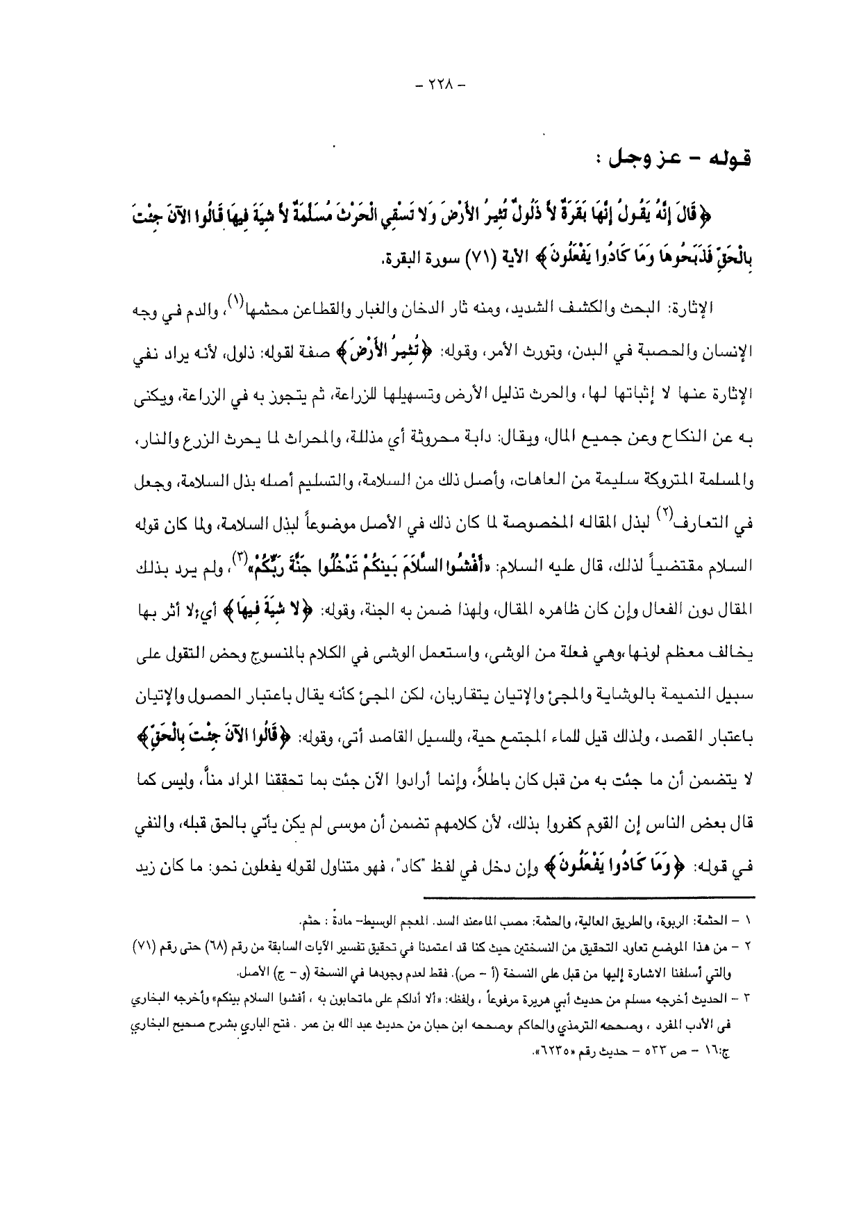 البحث والكشف الشديدة ومنه ثار الدخان والغبار والقطاعن محثمها، والدم في وجه الإنسان والحصبة في البدن، وتورث الأمر، وقوله: {تُثِيرُ الْأَرْضَ} صفة لقوله: ذلول، لأنه يراد نفي الإثارة عنها لا إثباتها لها، والحرث تذليل الأرض وتسهيلها للزراعة، ثم يتجوز به في الزراعة، ويكنى به عن النكاح وعن جميع المال، ويقال: دابة محروثة أي مذللة، والمحراث لما يحرث الزرع والنار، والمسلمة المتروكة سليمة من العاهات، وأصل ذلك من السلامة، والتسليم أصله بذل السلامة، وجعل