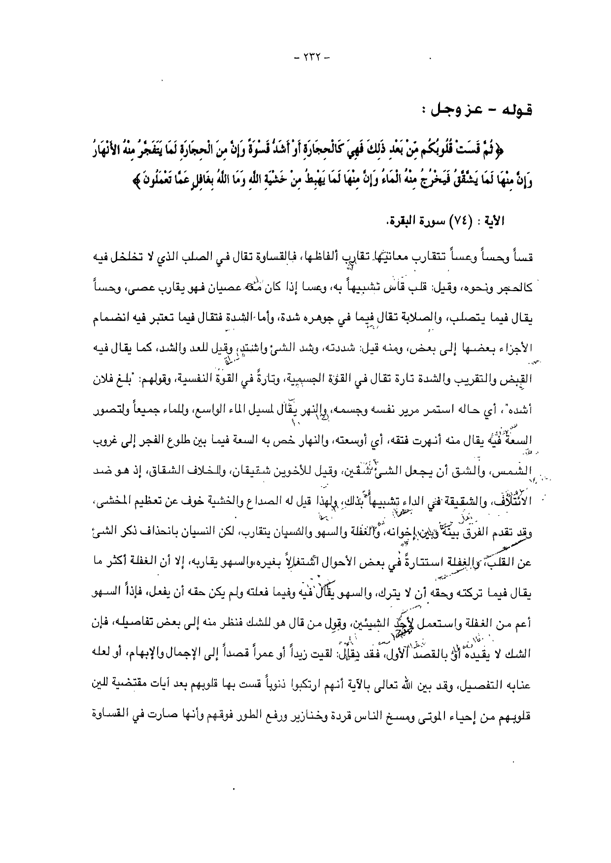 فيه يقال منه أنهرت فتقه، أي أوسعته، والنهار خص به السعة فيما بين طلوع الفجر إلى غروب الشمس، وألشق أن يجعل الشك شقين، وقيل للأخوين شقيقان، وللخلاف الشقاق، إذ هو ضد الائتلاف، والشقيقة في الداء تشبيهاً بذلك، ولهذا قيل له الصداع والخشية خوف عن تعظيم المخشى، وقد تقدم الفرق بينه وبين إخوانه والغفلة والسهو والنسيان يتقارب، لكن النسيان بانحذاف ذكر الشيء عن القلب والغفلة استتارة في بعض الأحوال اشتغالاً بغيره، والسهو يقاربه، إلا أن الغفلة أكثر ما يقال فيما تركته وحقه أن لا يترك، والسهو يقال فيه وفيما فعلته ولم يكن حقه أن يفعل، فإذا السهو أعم من الغفلة واستعمل لأحد الشيئين، وقول من قال هو للشك فنظر منه إلى بعض تفاصيله، فإن الشك لا يقيده او بالقصد الأول، فقد يقال: لقيت زيدا أو عمرو قصداً إلى الإجمال والإبهام، أو لعله عنابه التفصيل، وقود بين الله تعالى بالآية أنهم ارتكبوا ذنوباً قست بها قلوبهم بعد آيات مقتضية للين