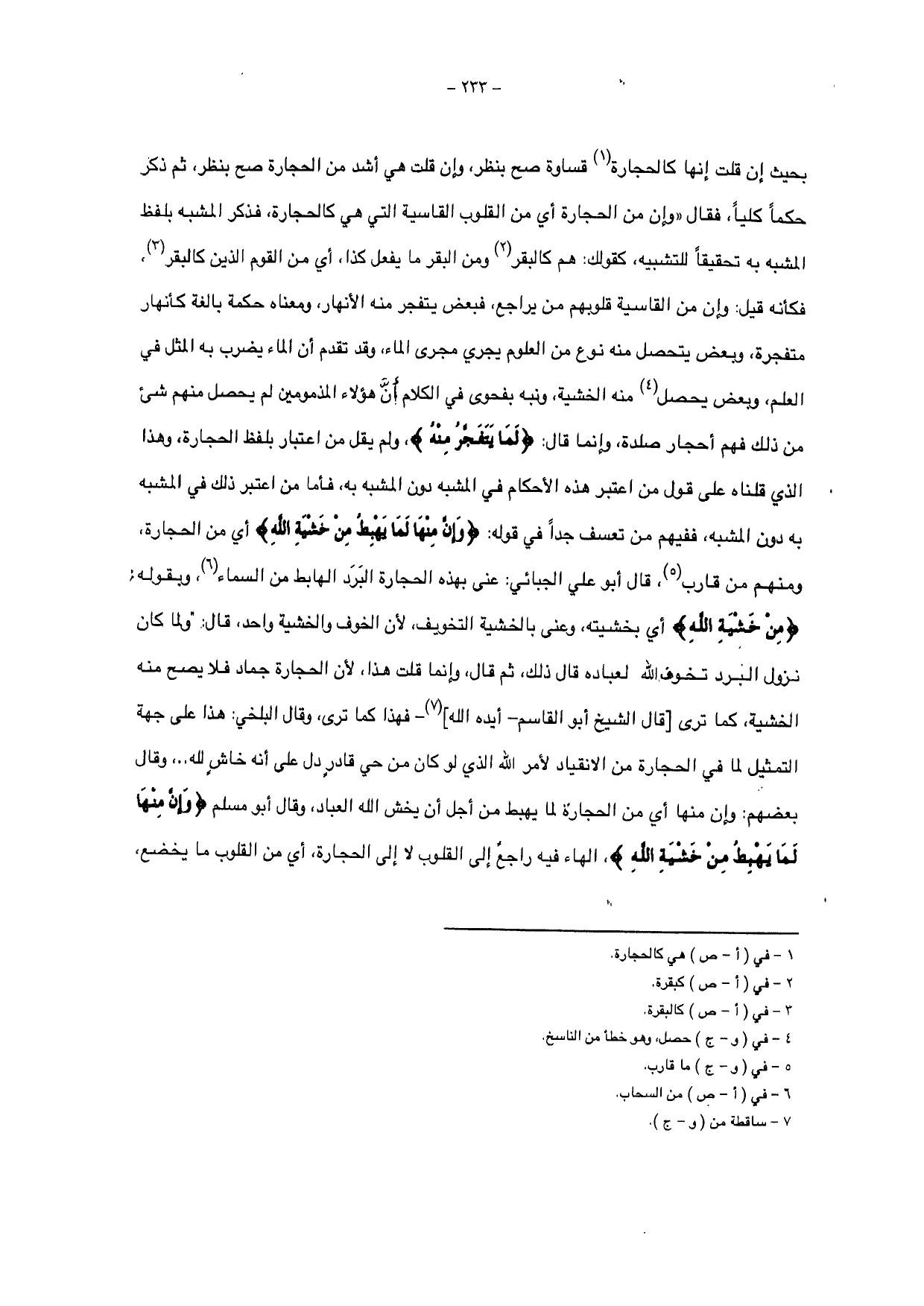 ومنهم من قارب، قال أبو علي الجبائي: عنى لهذه الحجارة البرد الهابط من السماء، وبقوله: {مِنْ خَشْيَةِ اللَّهِ} أي بخشيته، وعنى بالخشية التخويف، لأن الخوف والخشية واحد، قال: " ولما كان نزول البرد تخوفا ألفه لعباده قال ذلك، ثم قال، وإنما قلت هذا، لأن الحجارة جماد فلا يصح منه الخشية، كما ترى [قال الشيخ أبو القاسم- أيده الله]- فهذا كما ترى، وقال البلخي: هذا على جهة التمثيل لا في الحجارة من الانقياد لأمر الله الذي لو كان من حي قادر دل على أنه حاش لله ...