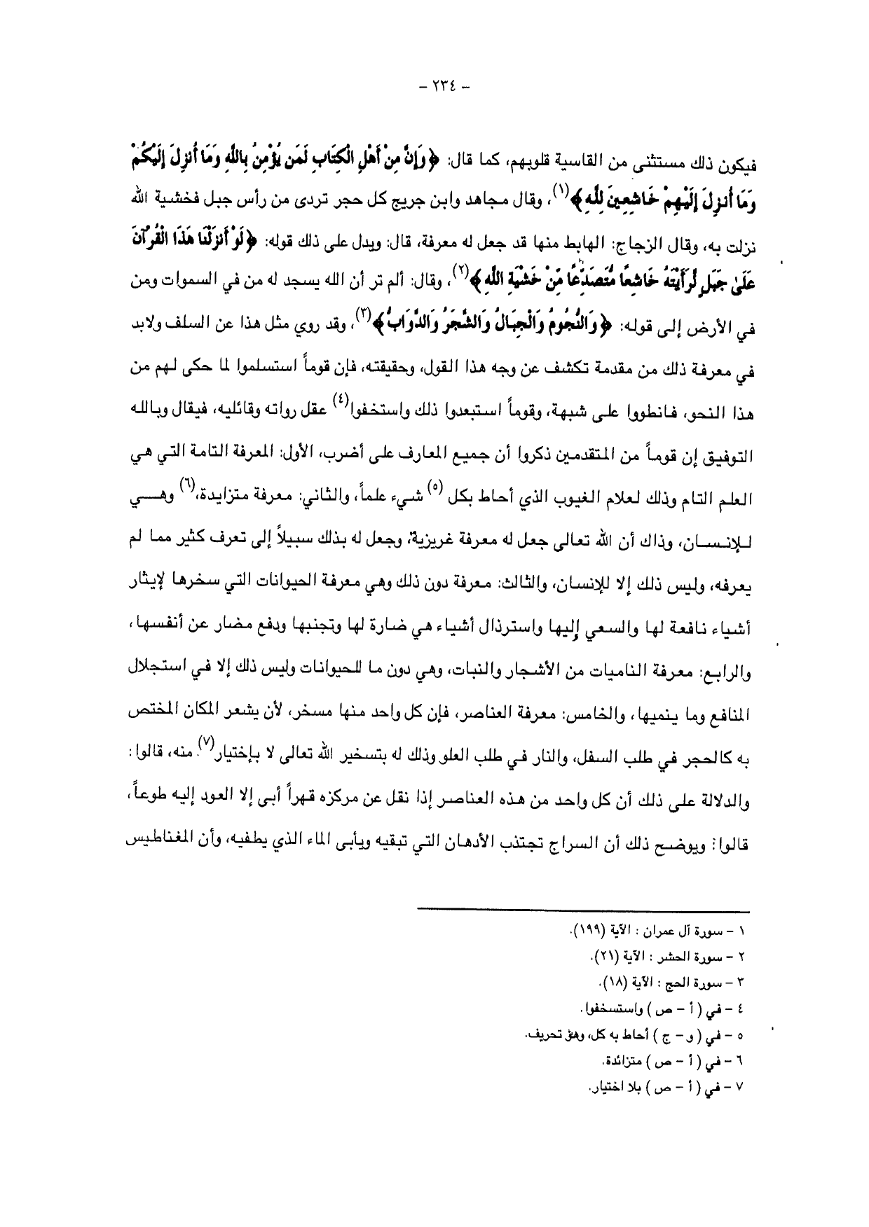فيكون ذلك مستثنى من القاسية قلوبهم، {وَإِنَّ مِنْ أَهْلِ الْكِتَابِ لَمَنْ يُؤْمِنُ بِاللَّهِ وَمَا أُنْزِلَ إِلَيْكُمْ وَمَا أُنْزِلَ إِلَيْهِمْ خَاشِعِينَ لِلَّهِ}.وقال مجاهد وابن جريح كل حجر تردى من رأس جبل فخشية الله نزلت به، وقال الزجاج: الهابط منها قد جعل له معرفة، قال: ويدل على ذلك قوله: {لَوْ أَنْزَلْنَا هَذَا الْقُرْآنَ عَلَى جَبَلٍ لَرَأَيْتَهُ خَاشِعًا مُتَصَدِّعًا مِنْ خَشْيَةِ اللَّهِ}، وقال: ألم تر أن الله يسجد له من في السموات ومن في الأرض إلى قوله: {وَالنُّجُومُ وَالْجِبَالُ وَالشَّجَرُ وَالدَّوَابُّ}، وقد روي مثل هذا عن السلف ولابد في معرفة ذلك من مقدمة تكشف عن وجه هذا القول، وحقيقته، فإن قوما استسلموا لا حكى لهم من هذا النحو، فانطووا على شبهة، وقومي استبعدوا ذلك واستخفوا عقل رواته وقائليه، فيقال وبالله التوفيق إن قوماً من المتقدمين ذكروا أن جميع المعارف على أضرب، الأول: المغرفة التامة التي هي العلم التام وذلك لعلام الغيوب الذي أحاط بكل شيءعلماً، والثاني: معرفة متزايدة، وهي للإنسان، وذاك أن الله تعالى جعل له معرفة غريزية، وجعل له بذلك سبيلاً إلى تعرف كثير مما لم يعرفه، وليس ذلك إلا للإنسان، والثالث: معرفة دون ذلك وهي معرفة الحيوانات التي سخرها لإيثار أشياء نافعة لها والسعي أوليها واسترسال أشياء هي ضارة لها وتجنبها ودفع مضار عن أنفسها، والرابع: معرفة الناميات من الأشجار والنبات، وهي دون ما للحيوانات وليس ذلك إلا في استجلال النافع وما ينميها، والخامس: معرفة العناصر، فإن كل واحد منها مسخر، لأن يشعر المكان المختص به كالحجر في طلب السفر، والنار في طلب العلو ودلك له بتسخير الله تعالى لا باختيار منه، قالوا: والدلالة على ذلك أن كل واحد من هذه العناصر إذا نقل عن مركزه قهرا أبى إلا العود إليه طوعأ، قالوا: ويوضح ذلك أن السراج تجتذب الأدهان التي تبقيه ويأبى الماء الذي يطفيه، وأن المغناطيس