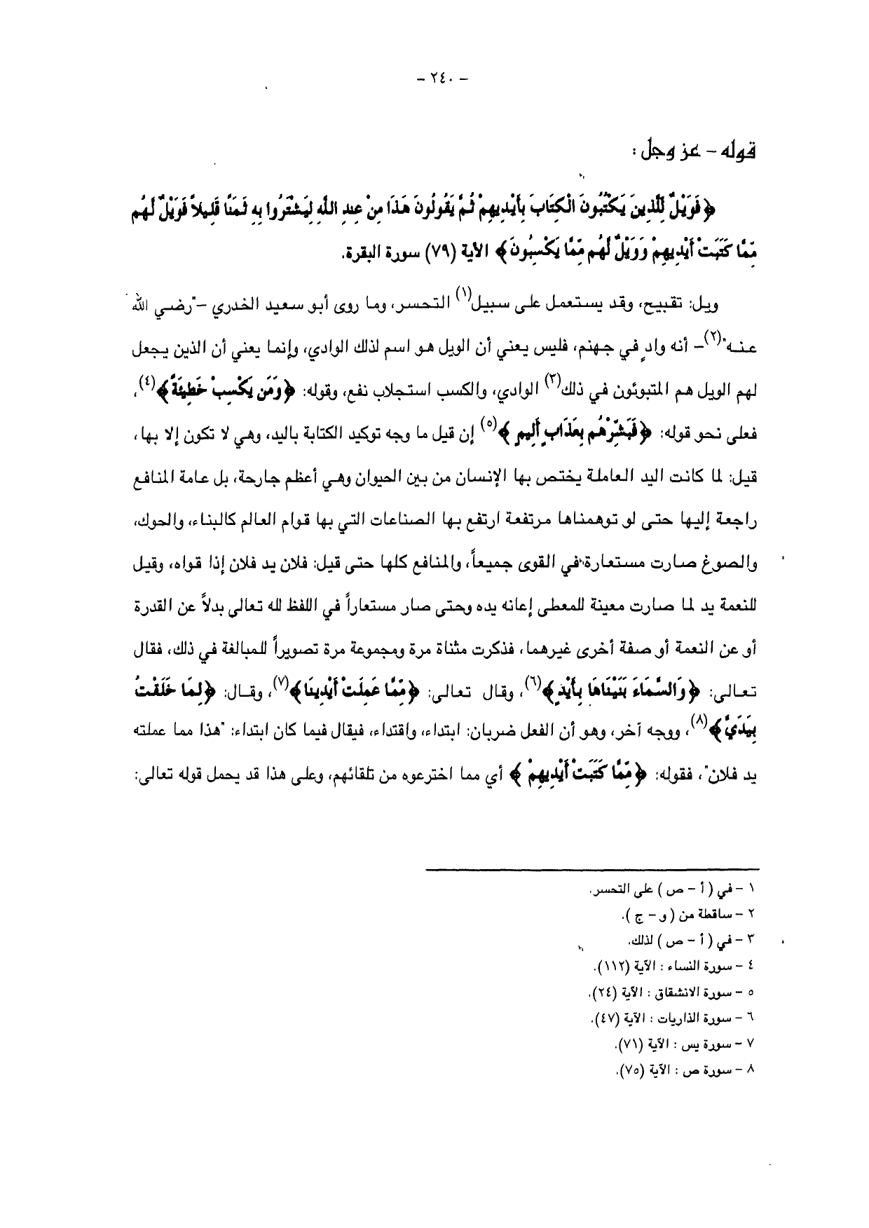 {فَوَيْلٌ لِلَّذِينَ يَكْتُبُونَ الْكِتَابَ بِأَيْدِيهِمْ ثُمَّ يَقُولُونَ هَذَا مِنْ عِنْدِ اللَّهِ لِيَشْتَرُوا بِهِ ثَمَنًا قَلِيلًا فَوَيْلٌ لَهُمْ مِمَّا كَتَبَتْ أَيْدِيهِمْ وَوَيْلٌ لَهُمْ مِمَّا يَكْسِبُونَ} الآية (79) سورة البقرة.