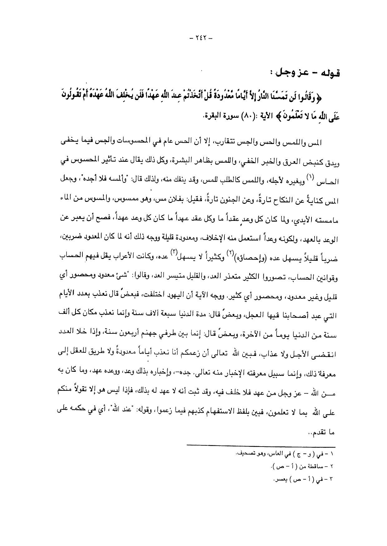 {وَقَالُوا لَنْ تَمَسَّنَا النَّارُ إِلَّا أَيَّامًا مَعْدُودَةً قُلْ أَتَّخَذْتُمْ عِنْدَ اللَّهِ عَهْدًا فَلَنْ يُخْلِفَ اللَّهُ عَهْدَهُ أَمْ تَقُولُونَ عَلَى اللَّهِ مَا لَا تَعْلَمُونَ} الآية: (80) سورة البقرة.