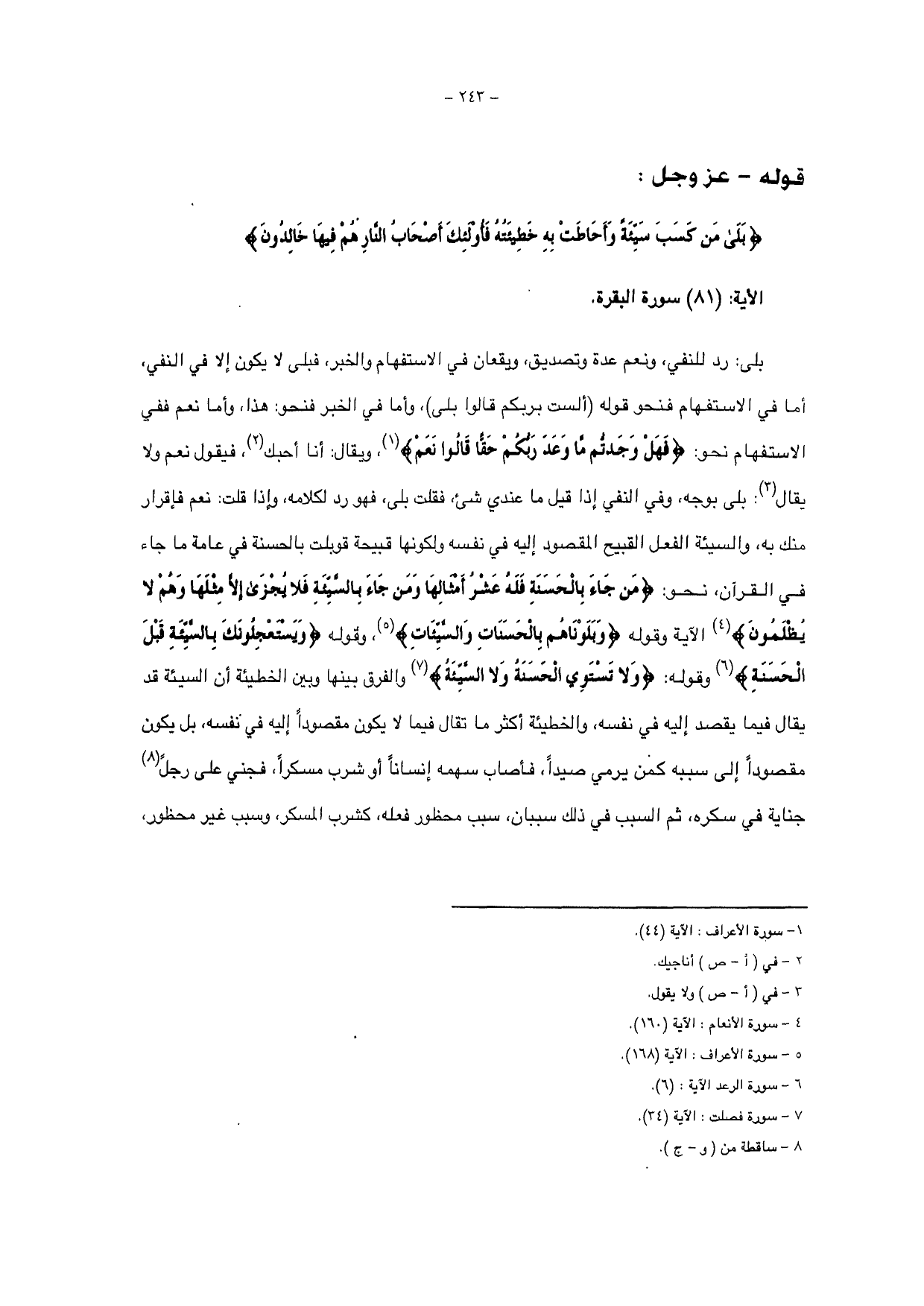 بلى: رد للنفي، ونعم عدة وتصديق، ويقعان في الاستفهام والخبر، فبلى لا يكون إلا في النفي، أما في الاستفهام فنحو قوله (ألست بربكم قالوا بلى)، وأما في الخبر فنحو: هذا، وأما نعم ففي الاستفهام نحو: {فَهَلْ وَجَدْتُمْ مَا وَعَدَ رَبُّكُمْ حَقًّا قَالُوا نَعَمْ}، ويقال: أنا أحبك، بل نعم ولا يقال: بلى بوجه، وفي النفي إدا قيل ما عندي شي، فقلت بلى، فهو رد لكلامه، وإذا قلت: نعم فإقرار منك به، والسيئة الفعل القبيح القيود إليه في نفسه ولكونها قبيحة قوبلت بالحسنة في عاهة ما جاء في القرآن، نحو: {مَنْ جَاءَ بِالْحَسَنَةِ فَلَهُ عَشْرُ أَمْثَالِهَا وَمَنْ جَاءَ بِالسَّيِّئَةِ فَلَا يُجْزَى إِلَّا مِثْلَهَا وَهُمْ لَا يُظْلَمُونَ} الآية وقوله {وَبَلَوْنَاهُمْ بِالْحَسَنَاتِ وَالسَّيِّئَاتِ}، وقوله {وَيَسْتَعْجِلُونَكَ بِالسَّيِّئَةِ قَبْلَ الْحَسَنَةِ} وقوله: {وَلَا تَسْتَوِي الْحَسَنَةُ وَلَا السَّيِّئَةُ} والفرق بينها وبين الخطيئة أن السيئة قد يقال فيما يقصد إليه في نفسه، والخطيئة أكثر ما تقال فيما لا يكون مقصوداً إليه في. نفسه، بل يكون مقصودا إلى سببه كمن يرمي صيداً، فأصاب سهمه إنساناً أو شرب مسكراً، فجني على رجل جناية في سكره، ثم السبب في دلك سببان، سبب محظور فعله، كشرب المسكر، وسبب غير محظور،