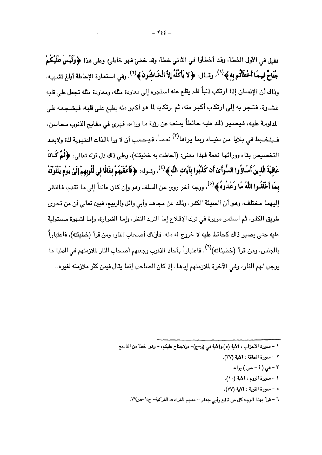 فقيل في الأول الخطأ، وقد أخطأوا في الثاني خطأ، وقد خطى فهو خاطئ، وعلى هذا {وَلَيْسَ عَلَيْكُمْ جُنَاحٌ فِيمَا أَخْطَأْتُمْ بِهِ} وقال: {لَا يَأْكُلُهُ إِلَّا الْخَاطِئُونَ}، وفي استعارة الاحاطة أبلغ تشبيه، وذاك أن الإنسان إدا ارتكب ذنباً فلم يقلع عنه استجرت إلى معاودة مثله، ومعاودة مثله تجعل على قلبه غشاوة، فتجر به إلى ارتكاب أكبر منه، ثم ارتكابه لا هو أكبر منه يطبع على قلبه، فيشجعه على المداومة عليه، فيصير ذلك عليه حائطا يمنعه عن رؤية ما وراء، فيرى في مقابح الذنوب محاسن، فيتخبط في بلايا من دنياه ربما يراها نعماً، فيحسب أن لا وراء اللذات الدنيوية لذة ولا بعد التخصيص بقاء وورائها نعما فهذا معنى: (أحاطت به خطيئته)، وعلى ذلك دل قوله تعالى: {ثُمَّ كَانَ عَاقِبَةَ الَّذِينَ أَسَاءُوا السُّوأَى أَنْ كَذَّبُوا بِآيَاتِ اللَّه}، وقوله: {فَأَعْقَبَهُمْ نِفَاقًا فِي قُلُوبِهِمْ إِلَى يَوْمِ يَلْقَوْنَهُ بِمَا أَخْلَفُوا اللَّهَ مَا وَعَدُوهُ}، ووجه أخر روى عن السلف وهو إن كان عائداً إلي ما تقدم، فالنظر إليهما مختلف، وهو أن السيئة الكفر، وذلك عن مجاهد وأبي وائل والربيع، فبين تعالى أن من تحرى طريق الكفر، ثم استمر مريرة في ترك الإقلاع إما الترك النظر، وإماما الشرارة، وإماما لشهوة مستولية عليه حتى يصير ذلك كحائط عليه لا خروج له منه، فأولئك أصحاب النار، ومن قرأ (خطيئته)، فاعتبارا بالجنس، ومن قرأ (خطيئاته)، فاعتبارا بآحاد الذنوب وجعلهم أصحاب النار لملازمتهم في الدنيا ما يوجب لهم النار، وهي الآخرة لملازمتهم إياهما إذ كان الصاحب إنما يقال فيمن كثر ملازمته لغيره ...