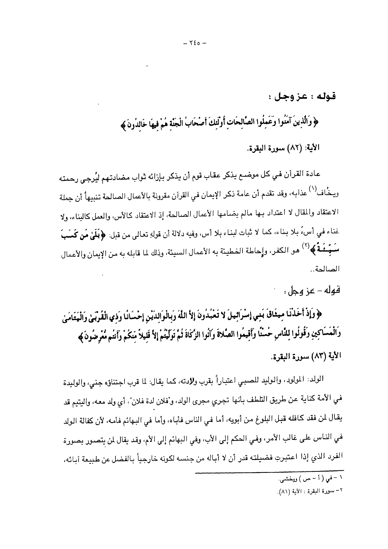عادة القرآن في كل موضع يذكر عقاب قوم أن يذكر بإزائه ثواب مضادتهم ليُرجى رحمته ويخاف عذابه، وقد تقدم أن عامة ذكر الإيمان في القرآن مقرونة بالأعمال الصالحة تنبيهاً أن جملة الاعتقاد والمقال لا اعتداد بها ما لم يضامها الأعمال الصالحة، إذ الاعتقاد كالأس، والعمل كالبناء، ولا غناء في أسء بلا بناء، كما لا ثبات لبناء بلا أس، وفيه دلالة أن قوله تعالى من قبل: {بَلَى مَنْ كَسَبَ سَيِّئَةً} هو الكفر، وإحاطة الخطيئة به الأعمال السيئة، وذلك لا قابله به من الإيمان والأعمال الصالحة ..