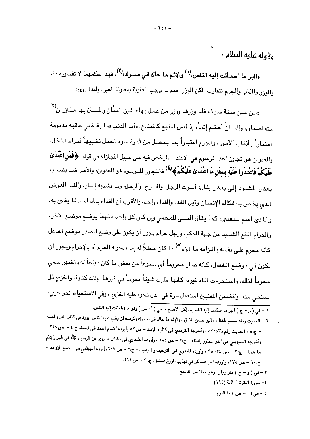 " من سن سنة سيئة فله وزرها ووزر من عمل بها "، فإن السان والمسنن بها متآزران متعاضدان، والسان أعظم إثما، إذ ليس المتبع كالمبتدع، وأما الذنب فما يقتضي عاقبة مذمومة اعتبارا بأذناب الأمور، والجرم اعتبارا بما يحصل من ثمرة سوء العمل تشبيها لجرام النخل، والعدوان هو تجاوز لحد المرسوم في الاعتداء المرخص فيه على سبيل المجازاة في قوله: {فَمَنِ اعْتَدَى عَلَيْكُمْ فَاعْتَدُوا عَلَيْهِ بِمِثْلِ مَا اعْتَدَى عَلَيْكُمْ} فالتجاوز للمرسوم هو العدوان، والأسر شد يضم به بعض المشدود إلى بعض يقال: أسرت الرجل، والسرح والرحل، وما يشدبه إسار، والفدا العوض الذي يخص به فكاك الإنسان وقيل الفدا والفداء واحد، والأقرب أن الفداء بالمد اسم لما يفدي به والفدى اسم للمفدى، كما يقال الحمى للمحمي وإن كان كل واحد منهما يوضع موضع الأخر، والحرام المنع الشديد من جهة الحكم، ورجل حرام يجوز أن يكون على وضع المصدر موضع الفاعل كأنه محرم على نفسه بالتزامه ما ألزم ما كان محللاً له إما بدخوله الحرم أو بالإحرام، ويجور أن يكون في موضع المفعول، كأنه صار محروماً أي ممنوعة من بعض ما كان مباحا له والشهر سمي محرما لذلك، واستحرمت الماء غيره، كأنها طلبت شيئا محرما في غيرها، وذلك كناية، والخزي ذل يستحي منه، ولتضمن المعنيين استعمل تارة في الذل نحو: عليه الخزي، وفي الاستحياء، نحو خزي،