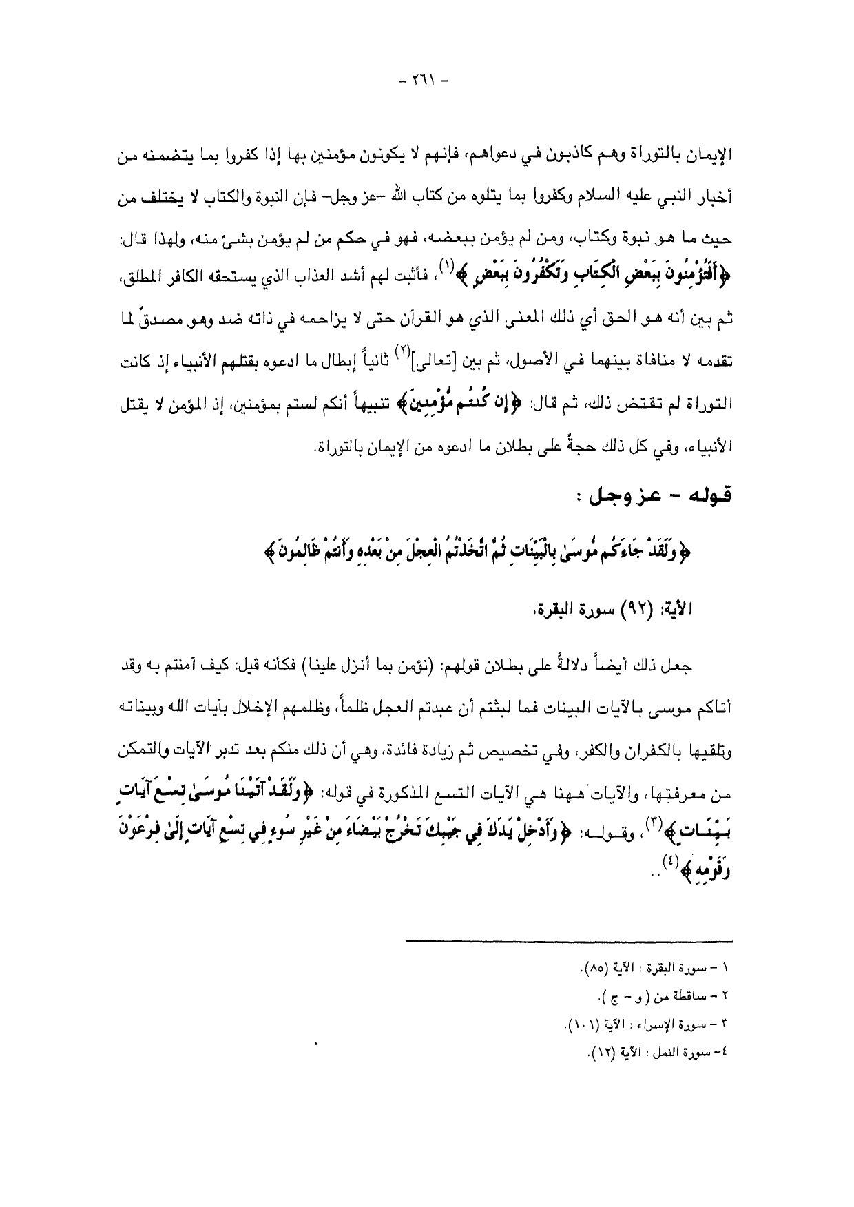 الإيمان بالتوراة وهم كاذبون في دعواهم، فإنهم لا يكونون مؤمنين بها إذا كفروا بما يتضمنه من أخبار النبي عليه السلام وكفروا بما يتلوه من كتاب الله - عز وجل- فإن النبوة والكتاب لا يختلف من حيث ما هو نبوة وكتاب، ومن لم يؤمن ببعضه، فهو في حكم من لم يؤمن بشيء منه، ولهذا قال: {أَفَتُؤْمِنُونَ بِبَعْضِ الْكِتَابِ وَتَكْفُرُونَ بِبَعْضٍ}، فأثبت لهم أشد العذاب الذي يستحقه الكافر المطلق، ثم بين أنه هو الحق أي ذلك المعنى الذي هو القرآن حتى لا يزاحمه في ذاته ضد وهو مصدق لما تقدمه لا منافاة بينهما في ألاصول، ثم بين [تعالى] ثانياً إبطال ما ادعوه بقتلهم الأنبياء إن كانت التوراة لم تقتض ذلك، ثم قال: {إِنْ كُنْتُمْ مُؤْمِنِينَ} تنبيها أنكم لستم بمؤمنين، إذ المؤمن لا يقتل الأنبياء، وفي كل ذلك حجة على بطلان ما ادعوه من الإيمان بالتوراة.