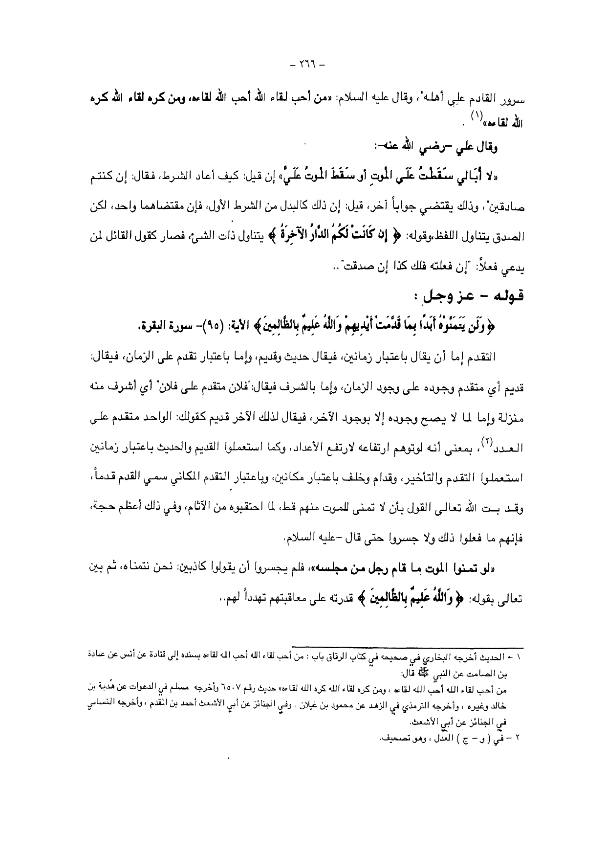 التقدم إما أن يقال باعتبار زمانين، فيقال حديث وقديم، وإما باعتبار تقدم على الزمان، فيقال: قديم أي متقدم وجوده على وجود الزمان وإما بالشرف فيقال: " فلان متقدم على فلأن " أي أشرف منه منزلة وإما لما لا يصح وجوده إلا بوجود الأخر، فيقال لذلك الآخر قديم كقولك: الواحد متقدم على العدد، بمعنى أنه لو توهم ارتفاعه لارتفع الأعداد، وكما استعملوا القديم والحديث باعتبار زمانين استعملوا التقدم والتأخير، وقدام وخلف باعتبار مكانين، وباعتبار التقدم المكاني سمي القدم قدماً، وقد بت الله تعالى القول بأن لا تمنى للموت منهم قط، لما احتقبوه من الآثام، وفي ذلك أعظم حجة، فإنهم ما فعلوا ذلك ولا جسروا حتى قال - عليه السلام.