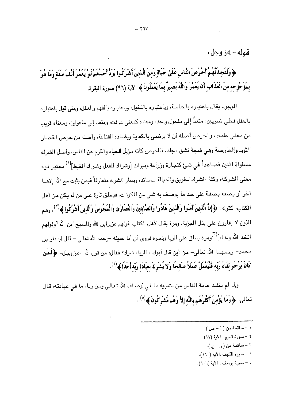 الوجود يقال باعتباره بالحاسة، وباعتباره بالتخيل، وباعتباره بالفهم والعقل، ومتى قيل باعتباره بالعقل فعلى ضربين: متعب إلى مفعول واحد، ومعناه كمعنى عرفت، ومؤكد إلى مفعولين، ومعناه قريب من معنى علمت، والحرص أصله أن لا يرضى بالكفاية ويضاده القناعة، وأصله هن حرص القصار الثوب، والحارصة وهي شجة تشق الجلد، فالحرص كأنه مزيل للحياء والكرم عن النفس، وأصل الشرك مساواة اثنين فصاعداً في شيء كتجارة وزراعة وميرات [وشراك للفعل وشراك الخيط] معتبر فيه معنى الشركة، وكذا الشرك للطريق والحبالة للصائد، وصار الشرك متعارفاً فيمن يثبت مع الله إلاها آخر أو يصفه بصفة على حد ما يوصف به شي من المكونات فيطلق تارة على من لم يكن من أهل الكتاب، كقوله: {إِنَّ الَّذِينَ آمَنُوا وَالَّذِينَ هَادُوا وَالصَّابِئِينَ وَالنَّصَارَى وَالْمَجُوسَ وَالَّذِينَ أَشْرَكُوا}، وهم الذين لا يقارون على بذل الجزية، ومرة يقال لأهل الكتاب لقولهم عزيز ابن الله والمسيح ابن الله [وقولهم اتخذ الله ولداً] ومرة يطلق على الربا ونحوه فروى أن أبا حنيفة- رحمه الله تعالي- قال لجعفر بن