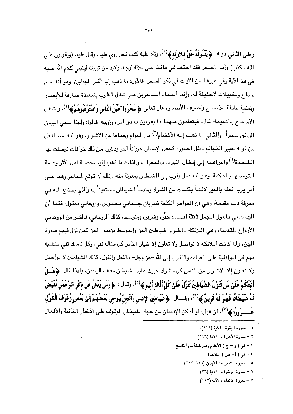 وعلى الثاني قوله: {يَتْلُونَهُ حَقَّ تِلَاوَتِهِ}، وتلا عليه كذب نحو روي عليه، وقال عليه، (ويقولون علي الله الكذب) وأما السحر فقد اختلف في مائيته على ثلاثة أوجه، ولابد من تبيينه لينبني كلام الله عليه في هذه الآية وفي غيرها من الآيات في ذكر السحر، فالأول: ما ذهب إليه أكثر الجدليين، وهو أنه اسم خداع وتخييلات لا حقيقة له، وإنما اعتماد الساحرين على شغل القلوب بشعبذة صارفة للأبصار وتمتمة عميقة للأسماع ولصرف الأبصار، قال تعالى {سَحَرُوا أَعْيُنَ النَّاسِ وَاسْتَرْهَبُوهُمْ}، ولشغل الأسماع بالنميمة، قال: فيتعلمون منهما ما يفرقون به بين المرء وزوجه، قالوا: ولهذا سمي البيانالرائق سحراً، والثاني ما ذهب إليه الأغشام من العوام وجماعة من الأشرار، وهو أنه اسم لفعل من قوته تغيير الطبائع ونقل الصور، كجعل الإنسان حيواناً أخر وذكروا من ذلك خرافات توصلت بها الملحدة والبراهمة إلى إبطال النبوات والمعجزات، والثالث ما ذهب إليه محصلة أهل الأثر وعامة