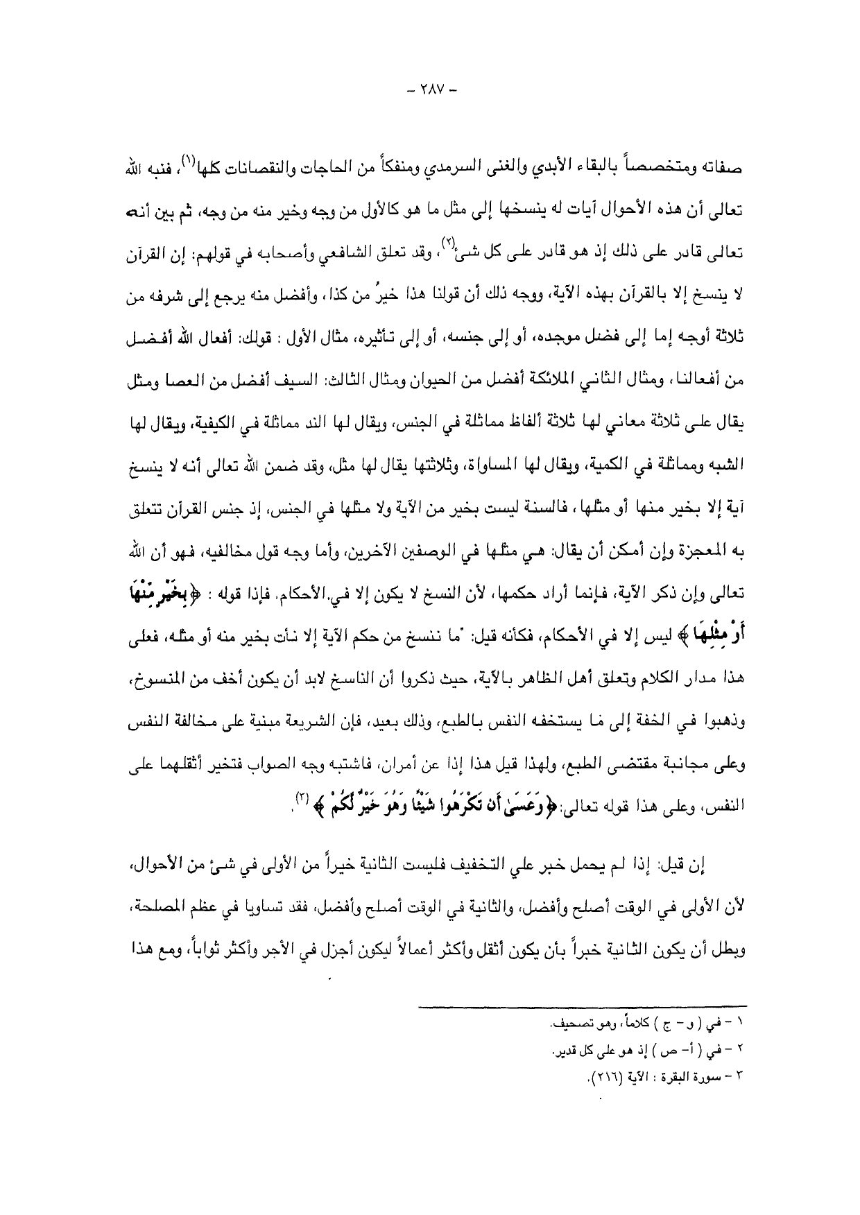 قلنا يصح أن يقال هو هو إذا اعتبر بنفسه ولم يعتبر بكسوته التي هي اللفظ، ويصح أن يقال: هو مثله إذا لم يعتبر بنفسه فقط، بل اعتبر باللفظ، ونحو ذلك أن يقال ماء البئر هو ماء النهر إذا اعتبر جنس الماء، وتارة يقال: مثل ماء النهر إذا اعتبر قرار الماء، وعلى قول من جعل الإنسان ترك اللفظ حتى تنسى قال: معناه: إدا أزيل حكم آية أو أنسى لفظها نأت بما هو أوفق لكم وأقرب إلى أن يبلغوا به إلى ما أريد منكم، ثم قال: {أَلَمْ تَعْلَمْ أَنَّ اللَّهَ عَلَى كُلِّ شَيْءٍ قَدِيرٌ} أي لا تحسبن أن تغييري الحكم حالاً فحالاً وإن لم آت بالثاني في الابتداء هو العجز، فإن من علم قدرته على كل شي لا يظن ذلك، وإنما يعتبر ذلك لا يرجع إلى مصلحة العباد، وبدأ الأليق بهم في الوقت المتقدم الحكم المتقدم وفى الوقت المتأخر الحكم المتأخر، وقال بعض المحققة أن الآية مع هذا الظاهر تنبئ عن معنى لطيف، وهو أن الله تعالى خلق الإنسان خلقة تدرجه من حال إلى حال إلى أنما يصير كاملاً موصوفاً بعام