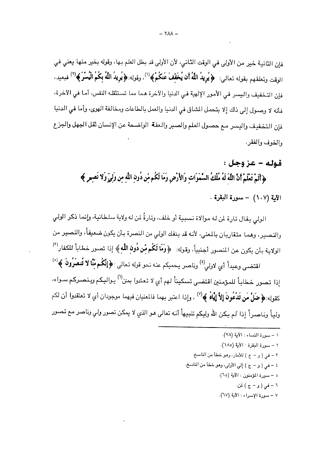 صفاته ومتخصصاً بالبقاء الأبدي والغنى السرمدي ومنفكاً من الحاجات والنقصانات كلها، فنبه الله تعالى أن هذه الأحوال آيات له ينسخها إلى مثل ما هو كالأول من وجه وخير منه من وجه، ثم بين أنه تعالى قادر على ذلك إذ هو قادر على كل شيء، وقد تعلق الشافعي وأصحابه في قولهم: إن القرآن لا ينسخ إلا بالقرآن بهذه الآية، ووجه ذلك أن قولنا هدا خير من كذا، وأفضل منه يرجع إلى شرفه من ثلاثة أوجه إما إلى فضل موجده، أو إلى جنسه، أو إلى تأثيره، مثال الأول: قولك: أفعال الله أفضل من أفعالنا، ومثال الثاني الملائكة أفضل من الحيوان ومثال الثالث: السيف أفضل من العصا ومثل يقال على ثلاثة معاني لها ثلاثة ألفاظ مماثلة في الجنس، ويقال لها الند مماثلة في الكيفية، ويقال لها الشبه ومماثلة في الكمية، ويقال لها المساواة، وثلاثتها يقال لها مثل، وقد ضمن الله تعالى أنه لا ينسخ آية إلا بخير منها أو مثلها، فالسنة ليست بخير من الآية ولا مثلها في الجنس، إذ جنس القرآن تتعلق به المعجزة وإن أمكن أن يقال: هي مثلها في الوصفين الآخرين، وأما وجه قول مخالفيه، فهو أن الله تعالى وإن ذكر الآية، فإنما أراد حكمها، لأن النسخ لا يكون إلا في الأحكام، فإذا قوله: {بِخَيْرٍ مِنْهَا أَوْ مِثْلِهَا} ليس إلا في الأحكام، فكأنه قيل: " ما ننسخ من حكم الآية إلاً نأت بخير منه أو مثله، فعلى هذا مدار الكلام وتعلق أهل الظاهر بالآية، حيث ذكروا أن الناسخ لابد أنما يكون أخف من المنسوخ، وذهبوا في الخفة إلى ما يستخفه النفس بالطبع، وذلك بعيدا فإن الشريعة مبنية على مخالفة النفس وعلى مجانبة مقتضى الطبع، ولهذا قيل هذا إذا عن أمران، فاشتبه وجه الصواب فتخير أثقلهما على النفس، وعلى هذا قوله تعالى: {وَعَسَى أَنْ تَكْرَهُوا شَيْئًا وَهُوَ خَيْرٌ لَكُمْ}.