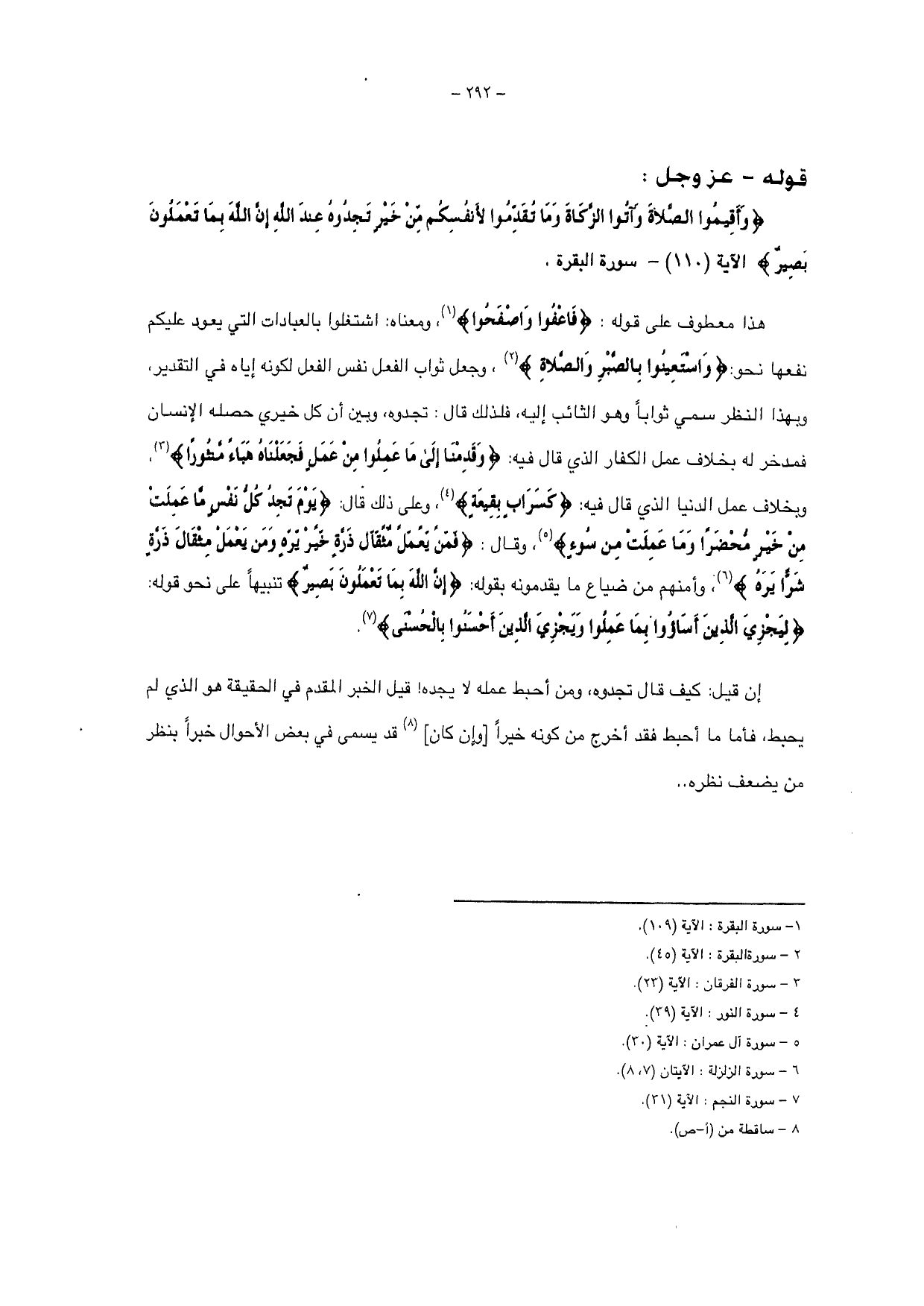 الحسد: كراهية نعمة على مستحق لها، وعدت من عظائم الذنوب، إذ هو معاندة الله في إرادته، وهو شر من البخل، فإن الحسد بخل على الغير بنعمة من لا تنفد العطايا نعمه، والعفو ترك العقوبة على المذنب، والصفح ترك ترئته، وقد يعفو الإنسان ولا يصفح، وصفحت عنه: أي أوليته مني صفحة جميلة معرضاً عن ذنبه، أو لقيت صفحته متجافياً عنه، أو تجاوزت الصفحة التي أثبت فيها ذنبه إلى غيرها من قولك: تصفحت الكتاب، وفي الآية تنبيه أن كثيراً من أهل الكتاب يتمنون ارتدادكم بعد إيمانكم حسداً، وقوله: (من عند أنفسهم) أي من عند هواهم كقوله تعالى: {وَاتَّبَعُوا أَهْوَاءَهُمْ}، وعبر عن الهوى بالنفس وهي الأمارة بالسوء، وبين أنهم فعلوا ذلك بعد وضوح الحق لهم، ولكنهم بحسدهم وهوائهم لا يتحرونه، ولا يحبون أن يتحراه غيرهم، ثم أمر بالتجافى عنهم إلى أن يأتي الله بأمره تسكيناً لهم ووعداً بتغييره لقدرته على كل شك، وروي عن ابن عباس- رضي الله تعالى عنهما- أن هذه الآية منسوخة بقوله: {فَاقْتُلُوا الْمُشْرِكِينَ حَيْثُ وَجَدْتُمُوهُمْ}، وقال غيره: هي غير منسوخه، وهذا الخلاف يرجع إلى اختلاف نظيرين، وذاك أن كل أمر ورد مقيداً بانتهاء ما معين أو غير معين فورود الأمر بخلافه يصح أن يقال: هو نسخ له من حيث إنه يرفع الأول، ويصح أن يقال: إنه ليس بنسخ، فإن النسخ في الأمر المطلق.