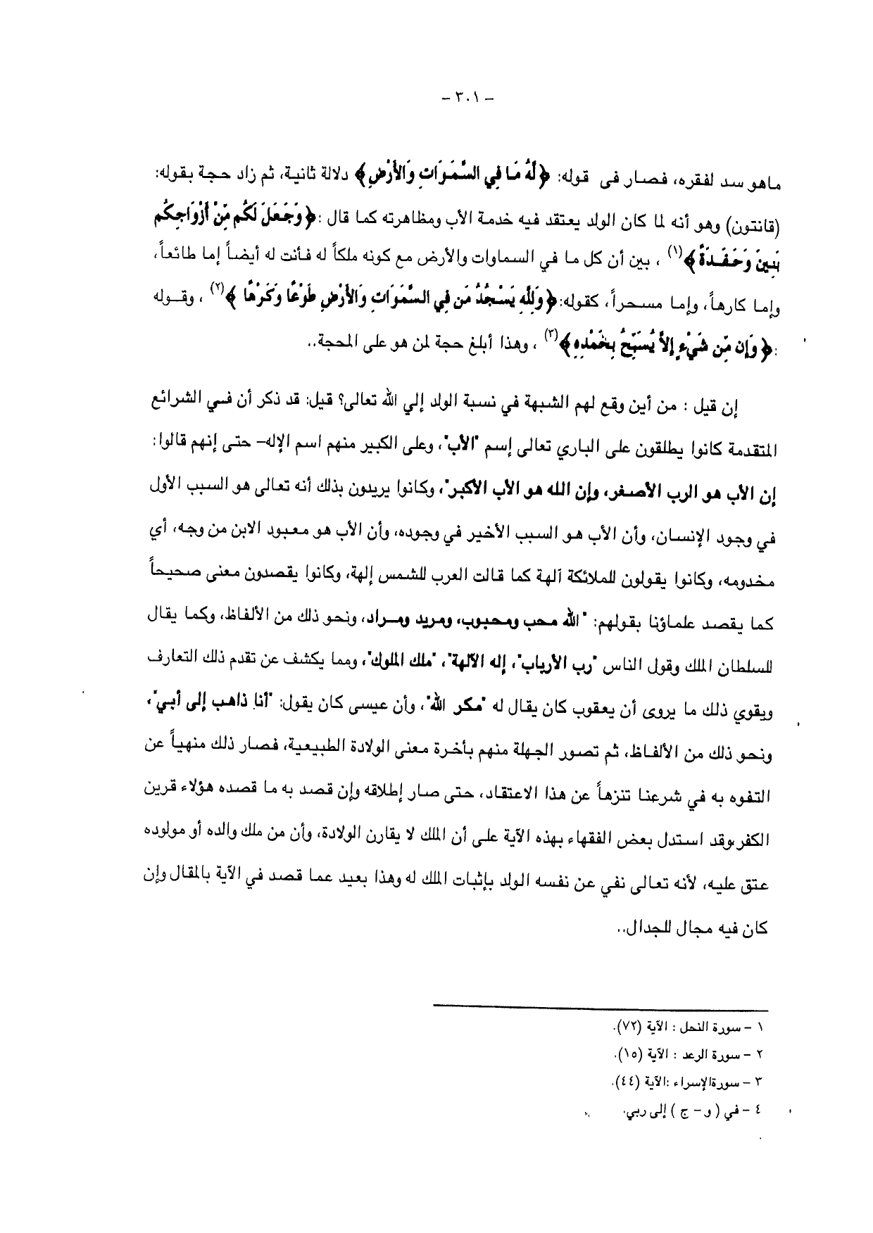 القنوت: لزوم الطاعة مع الخضوع، ولما كان لهما فسر بكل واحد منهما، فقيل في قوله: {وَقُومُوا لِلَّهِ قَانِتِينَ} أي خاضعين، وقيل طائعين، ولما كان من تمام القنوت القيام والسكون ما لم يكن أمر بخلافه واستعمل فيهما، فقيل في قول النبي - صلى الله عليه وسلم - لما قيل له: أي الصلاة أفضل؟ قال: طول القنوت " أي القيام، ولما ادعى النصارى في المسيح واليهود في عزير أنهما أبناء الله، ومشركوا العرب في الملائكة أنهم بنات الله تقدس ألفه تعالى عن ذلك، نبه على أقوى حجة على نفي ذلك وبيانها هو أن