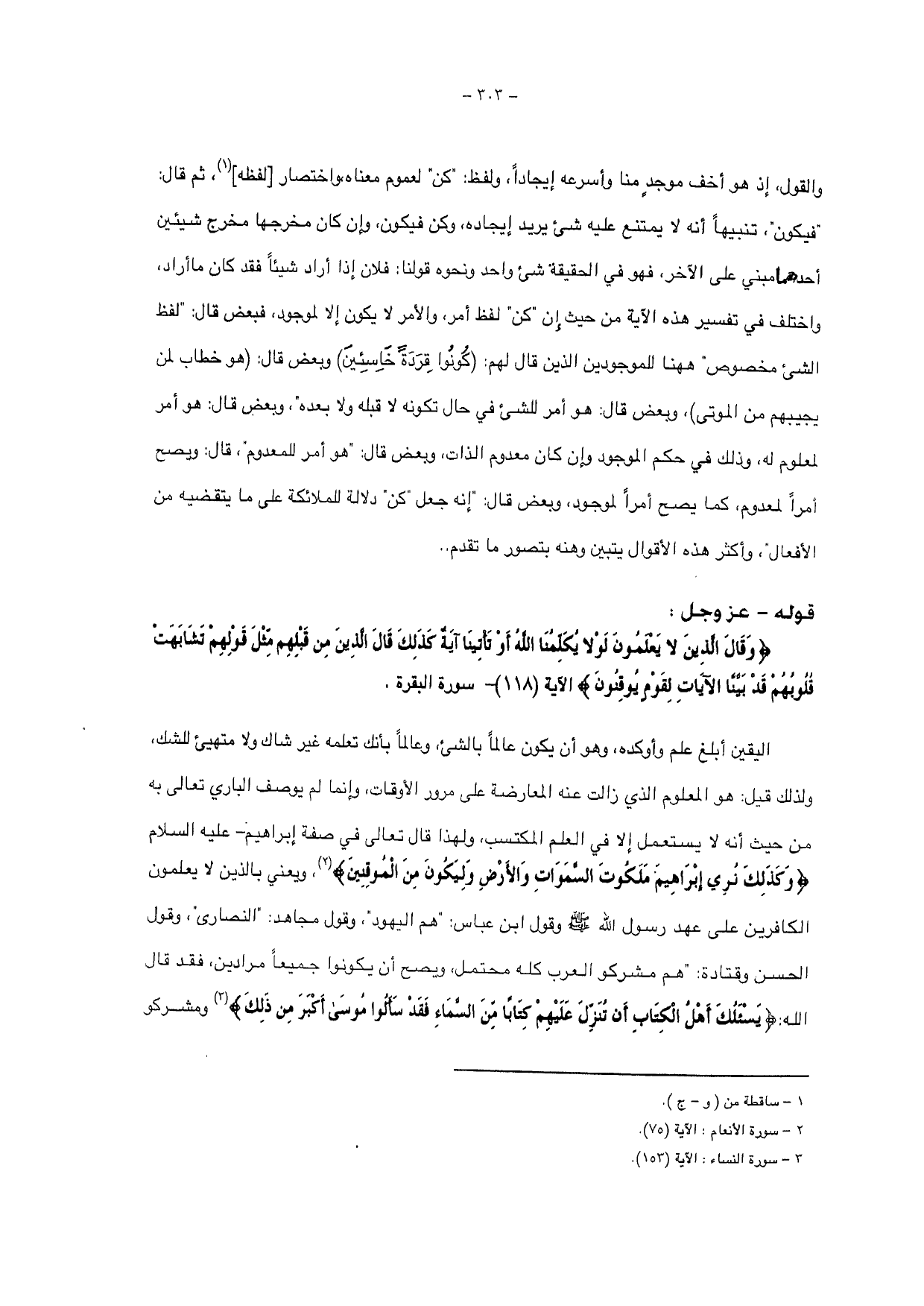 نحبه، وانقضى الأمر، وتقضى بلغ أخره، ذكره تعالى هذه الآية حجة رابعة شرحها أن الأب هو عنصر للابن، منه تكون، والله مبدع الأشياء كلها، فلا يكون عنصرا للولد، فمن المحال أن يكون المنفعل فاعلاً، وخص لفظ الإبداع لكونه أبلغ لفظاً وأبعده عن الاحتمال، وذلك أن أفعال الله تعالى على ثلاثة أوجه: إبداع وهو " اختراع " الشيء لا عن شيء ولا في زمان، ويستعمل ذلك في إيجاده تعالى المبادئ، و " صنع " وهو تركيب صورة مع العنصر، وتستعمل في إيجاده الأجسام، و " تسخير " وهو سوق الشيء إلى غرضه المقصود منه طوعاً أو قهراً، ويستعمل في القوى التي أوجدها في السحاب والأمطار والأغذية والأدوية، وكل هذه الثلاثة يقال له الخلق، وأقدمها الإبداع، ونبه بقوله: {قَضَى أَمْرًا} على حجة خامسة، وهو أن الولد يكون بنشر وتركيب حالاً بعد حال، وهو إذا أراد شيئاً فقد فعل بلا مهلة ولم يرد " بإذاً " حقيقة الزمان، إذ كان ذلك إشارة إلى ما قبل وجود الزمان، ولم يرد أيضاً " بكن " حقيقة اللفظ ولا بالفاء التعقيب الزماني، بل استعير كل ذلك ولأنه أقرب ما يتراءى لنا به سرعة الفصل وتمامه، وذكر لفظ " القضاء "، إذ هو لإتمام الفعل.