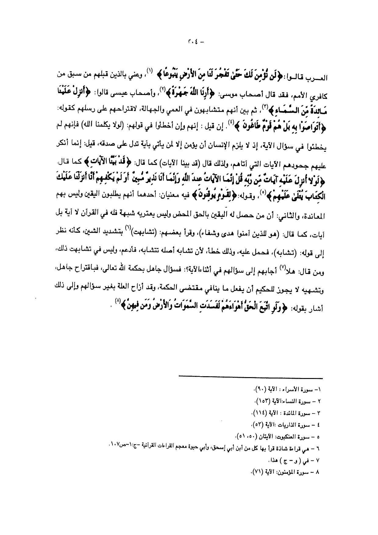 اليقين أبلغ علم وأوكده، وهو أن يكون عالم بالشئ، وعالماً بأنك تعلمه غير شاك ولا متهيئ للشك، ولذلك قيل: هو المعلوم الذي زالت عنه المعارضة على مرور الأوقات، وإنما لم يوصف الباري تعالى به من حيث أنه لا يستعمل إلا في العلم المكتسب، ولهذا قال تعالى في صفة إبراهيم- عليه السلام {وَكَذَلِكَ نُرِي إِبْرَاهِيمَ مَلَكُوتَ السَّمَاوَاتِ وَالْأَرْضِ وَلِيَكُونَ مِنَ الْمُوقِنِينَ}، ويعني بالذين لا يعلمون الكافرين على عهد رسول الله - صلى الله عليه وسلم - وقول ابن عباس: " هم اليهود "، وقول مجاهد: " النصارى "، وقول الحسن وقيادة: " هم مشركو العرب كله محتمل ويصح أن يكونوا جميعاً مرادين، فقد قال الله: {يَسْأَلُكَ أَهْلُ الْكِتَابِ أَنْ تُنَزِّلَ عَلَيْهِمْ كِتَابًا مِنَ السَّمَاءِ فَقَدْ سَأَلُوا مُوسَى أَكْبَرَ مِنْ ذَلِكَ} ومشركو