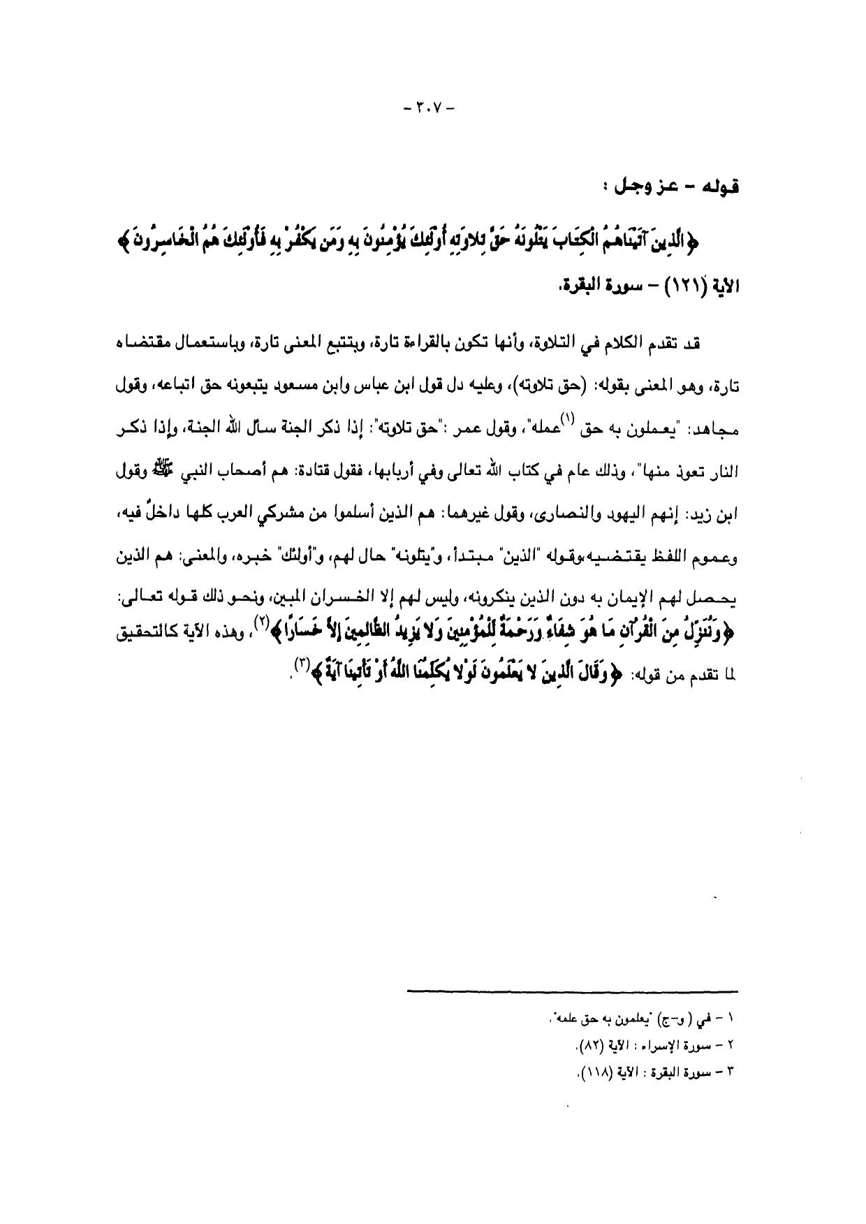 لم يكن من قبل الله على التقييد، كقولك: " ملَةُ مزدْكَ وغيرهِ "، والهوى: رأي عن شهوة داع إلى الضلال وسمي بذلك لأنه يهوي بصاحبه في الدنيا إلى كل داهية، وهي الآخرة إلى الهاوية، ولهذا سميت النارُ هاوية، ولشدة سلطانه وصفة الله بأنة إلهُ الكفار، فقال: {أَفَرَأَيْتَ مَنِ اتَّخَذَ إِلَهَهُ هَوَاهُ}، ومعنى الآية أن من خالفوك لا يرضون عنك إلاً بمتابعة ملتهم تنبيهاً أنه لا يرضيهم إلا ما لا يجوز وقوعه منك، ثم بين أن إتباعهم ليس بهدى، وأن الهدى هو هدي الله، أي إرشاده، كقوله {مَنْ يَهْدِ اللَّهُ فَهُوَ الْمُهْتَدِي}، ثم حذره فقال: {وَلَئِنِ اتَّبَعْتَ أَهْوَاءَهُمْ}، وذلك تحذير له ولأمته، ولكن خص بالذكر لأن أنبياء الله، بل أولياءه بأدنى ميل إلى ضال يكونون في حكم تابعي هواهم.