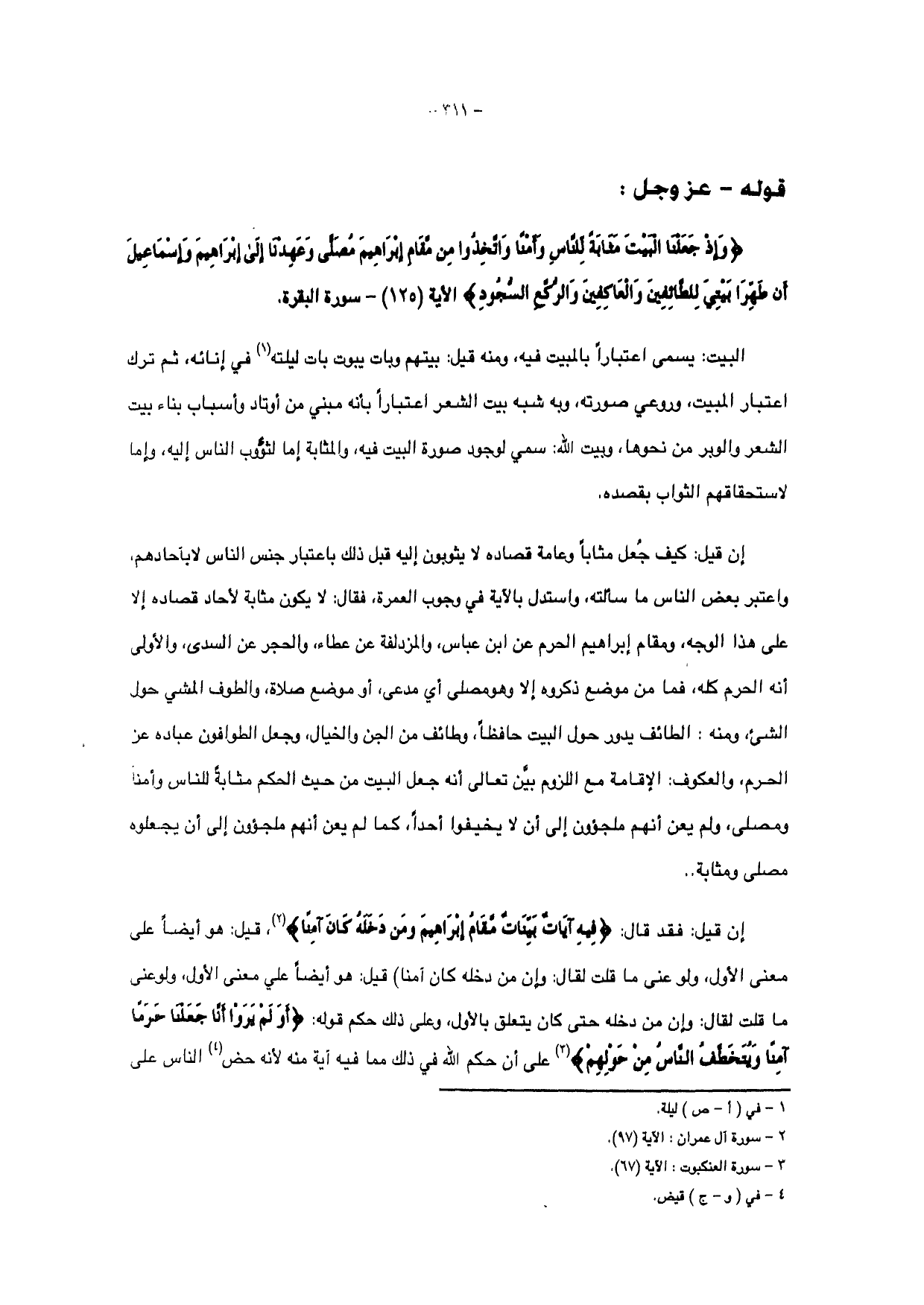 وقال: {مِلَّةَ أَبِيكُمْ إِبْرَاهِيمَ هُوَ سَمَّاكُمُ الْمُسْلِمِينَ مِنْ قَبْلُ}، وأمر- عليه السلام- بذكر إبراهيم في الصلاة، فقال: " اللهم صل على محمد وعلى آل محمد كما صليت على إبراهيم "، ولم يرد بالإمامة ههنا النبوة كما ظنه بعض المفسرين، فإنه- عليه السلام- إمام للناس على العموم في كل زمان على الإطلاق وليس بنبي لهم على [العموم] بالإطلاق، ولا قيل له ذلك قال: (ومن ذريتي)، فأجيب إلى ملتمسه بقوله: {لَا يَنَالُ عَهْدِي الظَّالِمِينَ} لكنه تعالى بين أنه قد يكون من ذريته ظالم، وبين أن الإمام يتحمل للعهد، والظالم لا عهد له، فإذاً لا إمامة له، ولهذا ما روي في الخبر أن الله تعالى يقول يوم القيامة لوالي السوء: (ياداعي السوء، أكلت اللحم، وشربت اللبن، ولبست الصوف، ولم تؤد الكسير ولم ترعها في مرعاها)، واستدل بالآية بعض الناس، فزعم أن الظالم إدا عوهد لم يلزم الوفاء بعهده، وقال الحسن: " إنما لم يجعل الله لهم عهداً " ....