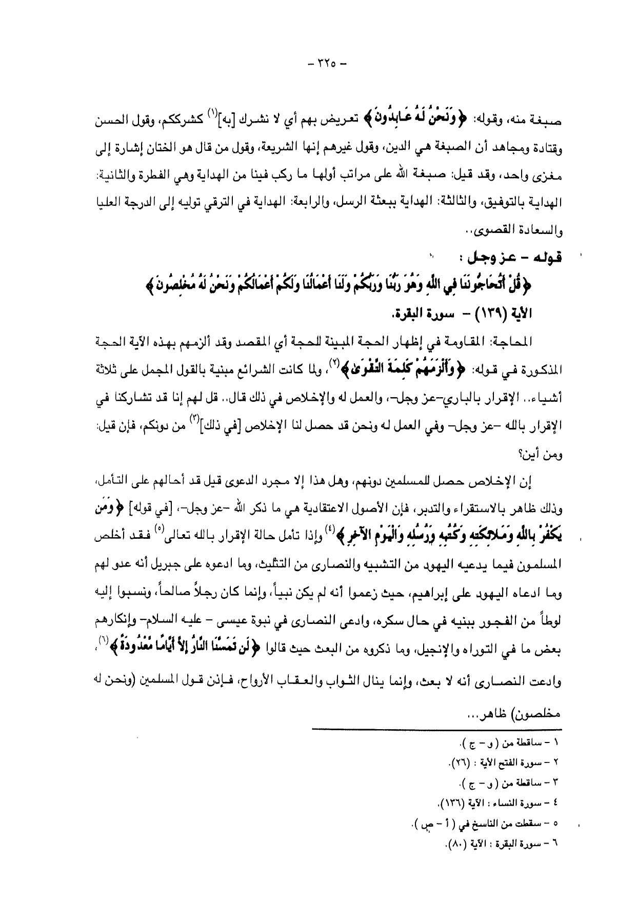 والمعنى بقوله- عليه السلام- " كل مولود يولد على الفطرة " الخير، وتسمية ذلك بالصبغة من حيث أن قوى الإنسان التي ركب عليها إذا اعتبرت بداية يجري مجرى الصبغة التي هي زينة للمصبوغ، ولما كانت اليهود والنصارى إذا لقنوا أولادهم اليهودية والنصرانية يقولون قد صبغناه بين تعالى أن الإيمان بمثل ما أمنتم به هو صبغة الله وفطرته التي ركزها في الخلق، ولا أحد أحسن