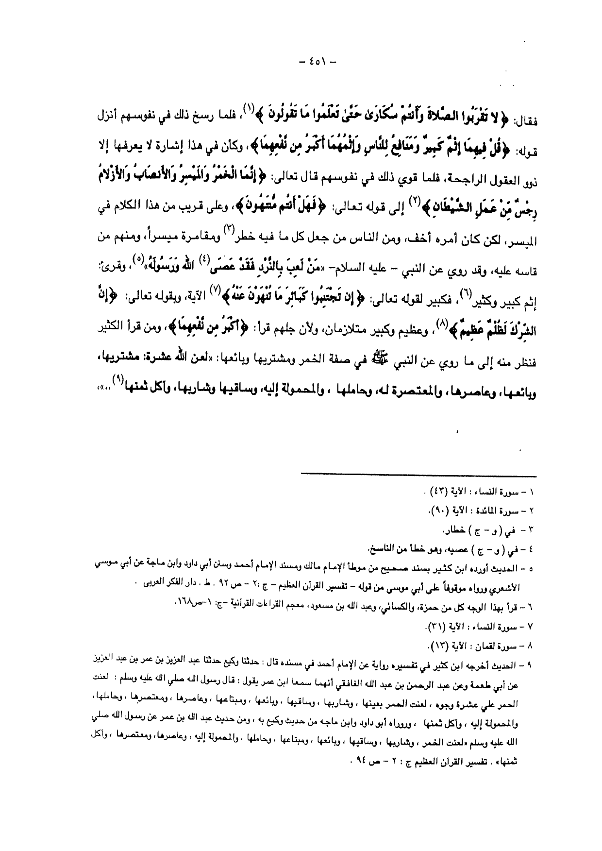فقال: {لَا تَقْرَبُوا الصَّلَاةَ وَأَنْتُمْ سُكَارَى حَتَّى تَعْلَمُوا مَا تَقُولُونَ} فلما رسخ ذلك في نفوسهم أنزل قوله: {قُلْ فِيهِمَا إِثْمٌ كَبِيرٌ وَمَنَافِعُ لِلنَّاسِ وَإِثْمُهُمَا أَكْبَرُ مِنْ نَفْعِهِمَا}، وكأن في هذا إشارة لا يعرفها إلا ذوو العقول الراجحة، فلما قوي ذلك في نفوسهم فال تعالى: {إِنَّمَا الْخَمْرُ وَالْمَيْسِرُ وَالْأَنْصَابُ وَالْأَزْلَامُ رِجْسٌ مِنْ عَمَلِ الشَّيْطَانِ} إلى قوله تعالى: {فَهَلْ أَنْتُمْ مُنْتَهُونَ} وعلى قريب من هذا الكلام في الميسر، لكن كان أمره أخف، ومن الناس من جعل كل ما فيه خطر ومقامرة ميسراً، ومنهم من قاسه عليه، وقد روي عن النبي- عليه السلام- " من لعب بالنرد فقد عصى الله ورسوله "، وقرئ: إثم كبير وكثير، فكبير لقوله تعالي: {إِنْ تَجْتَنِبُوا كَبَائِرَ مَا تُنْهَوْنَ عَنْهُ} الآية، وبقوله الله: {إِنَّ الشِّرْكَ لَظُلْمٌ عَظِيمٌ} وعظيم وكبير متلازمان، ولأن جلهم قرأ: {أَكْبَرُ مِنْ نَفْعِهِمَا}، ومن قرأ الكثير فنظر منه إلي ما روي عن النبي - صلى الله عليه وسلم - في صفة الخمر ومشتريها وبائعها: " لعن الله عشرة: مشتريها، وبائعها وعاصرها، والمعتصرة له، وحاملها، والمحمولة إليه، وساقيها وشاربها، وآكل ثمنها .. ".