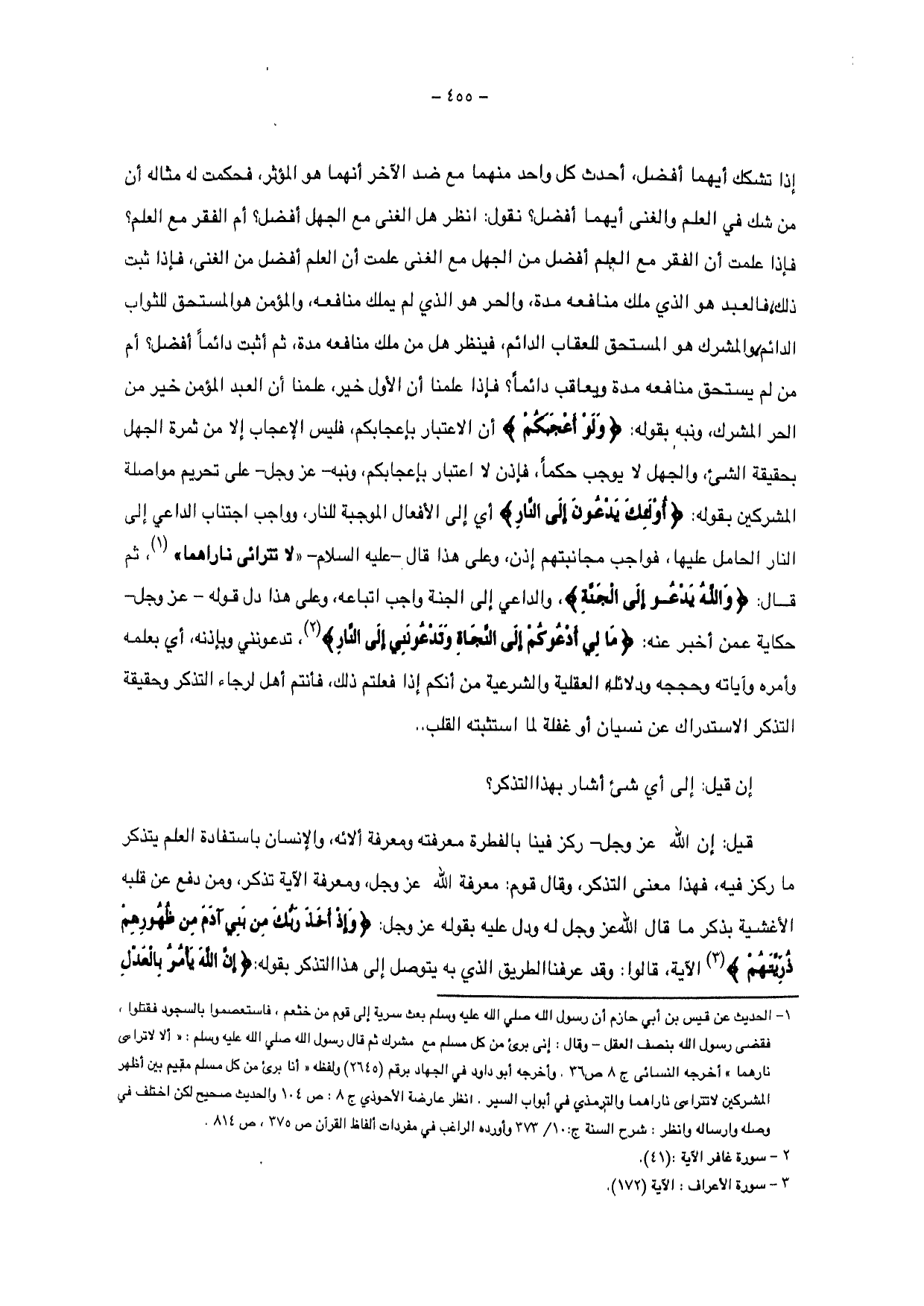 إذا تشكك أيهما أفضل، أحدث كل واحد منهما مع ضد الآخر أنهما هو المؤثر، فحكمت له مثاله أن من شك في العلم والغنى أيهما أفضل؟ نقول: انظر هل الغنى مع الجهل أفضل؟ أم الفقر مع العلم؟ فإذا علمت أن الفقر مع العلم أفضل من الجهل مع الغنى علمت أن العلم أفضل من الغنى، فإذا ثبت ذلك، فالعبد هو الذي ملك منافعه مدة، والحر هو الذي لم يملك منافعه، والمؤمن هو المستحق للثواب الدائم، والمشرك هو المستحق للعقاب الدائم، فينظر هل من ملك منافعه مدة ثم أثبت دائما أفضل؟ أم من لم يستحق منافعه مدة وتعاقب دائماً؟ فإذا علمنا أن الأول خير، علمنا أن العبد المؤمن خير من الحر المشرك، ونبه بقوله: {وَلَوْ أَعْجَبَتْكُمْ} أن الاعتبار بإعجابكم، فليس الإعجاب إلا من ثمرة الجهل بحقيقة الشيء والجهل لا يوجب حكماً، فإذن لا اعتبار بإعجابكم، ونبه - عز وجل - على تحريم مواصلة المشركين بقوله: {أُولَئِكَ يَدْعُونَ إِلَى النَّارِ} أي إلى الأفعال الوجبة للنار، وواجب اجتناب الداعي إلى النار الحامل عليها فواجب مجانبتهم إذن، وعلى هذا قال - عليه السلام - " لا تترائى ناراهما "، ثم قال: {وَاللَّهُ يَدْعُو إِلَى الْجَنَّةِ}، والداعي إلى الجنة واجب إتباعه، وعلى هذا دل قوله - عز وجل - حكاية عمن أخبر عنه: {مَا لِي أَدْعُوكُمْ إِلَى النَّجَاةِ وَتَدْعُونَنِي إِلَى النَّارِ}، تدعونني وبإذنه، أي بعلمه وأمره وآياته وحججه ودلائله العقلية والشرعية من أنكم إذا فعلتم ذلك، فأنتم أهل لرجاء التذكر وحقيقة التذكر الاستدراك عن نسيان أو غفلة لما استثبته القلب ..