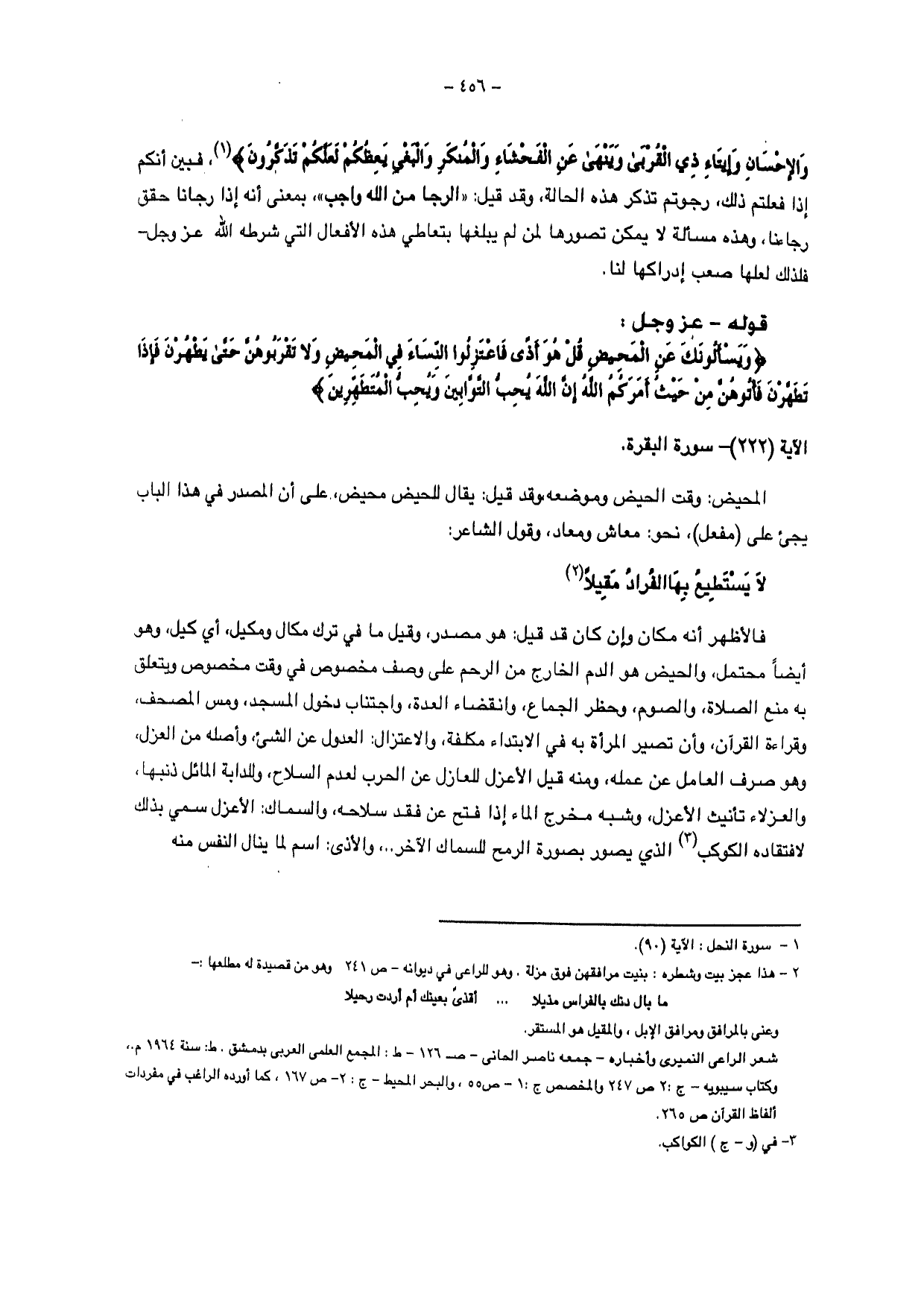 فالأظهر أنه مكان وإن كان قد قيل هو مصدر، وقيل ما في ترك مكال ومكيل، أي كيل وهو أيضا محتمل، والحيض هو الدم الخارج من الرحم على وصف مخصوص في وقت مخصوص ويتعلق به منع الصلاة، والصوم، وحظر الجماع، وانقضاء العدة، واجتناب دخول المسجد ومس المصحف، وقراءة القرآن، وأن تصير المرأة به في الابتداء مكلفة، والاعتزال: العدول عن الشيء، وأصله من العزل، وهو صرف العامل عن عمله، ومنه قيل الأعزل للعازل عن الحرب لعدم السلاح، وللدابة المائل ذنبها والعزلاء تأنيث الأعزل، وشبه مخرج الماء إذا فتح عن فقد سلاحه، والسماك الأعزل سمي بذلك لافتقاده الكوكب الذي يصور بصورة الرمح للسماك الأخر ..