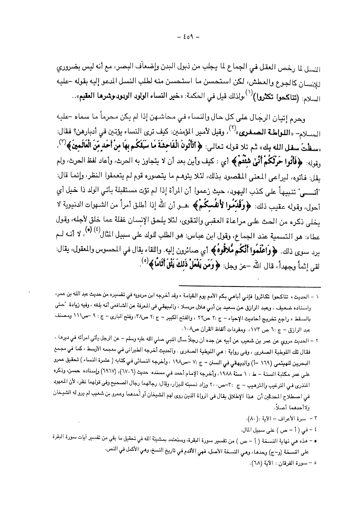 النسل لما رخص العقل في الجماع لما يجلب من ذبول البدن وإضعاف البصر، مع أنه ليس بضروري للإنسان كالجوع والعطش، لكن استحسن ما استحسن منه لطلب النسل المدعو إليه بقوله - عليه السلام: (تناكحوا تكثروا)، ولذلك قيل في الحكمة: " خير النساء الولود الولود، وشرها العقيم "،