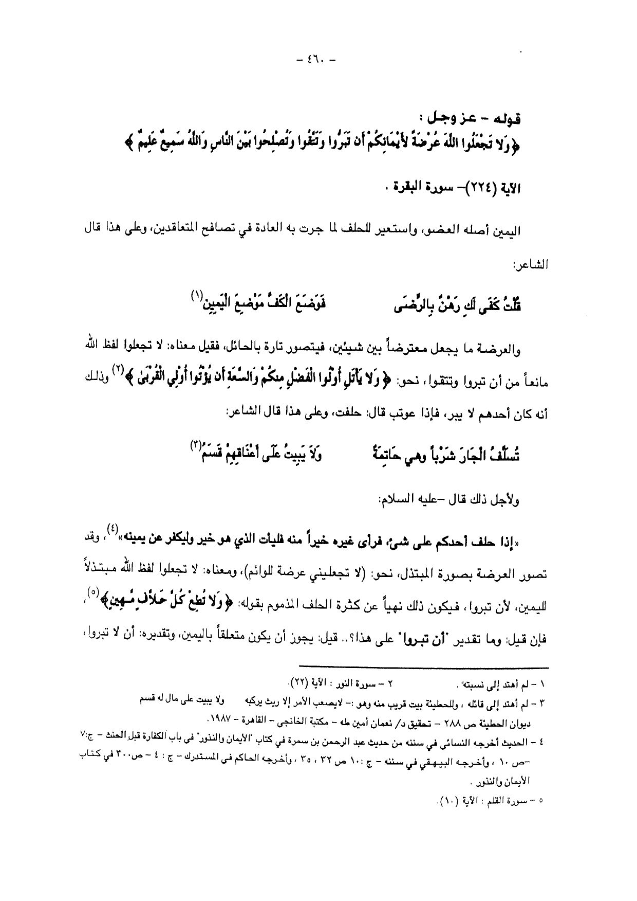 " إذا حلف أحدكم على شيء، فرأى غيره خيرا منه فليأت الذي هو خير وليكفر عن يمينه "، وقد تصور العرضة بصورة المبتذل، نحو: (لا تجعليني عرضة للوائم)، ومعناه: لا تجعلوا لفظ الله مبتذلا لليمين، لأن تبروا، فيكون ذلك نهيا عن كثرة الحلف المذموم بقوله: {وَلَا تُطِعْ كُلَّ حَلَّافٍ مَهِينٍ}