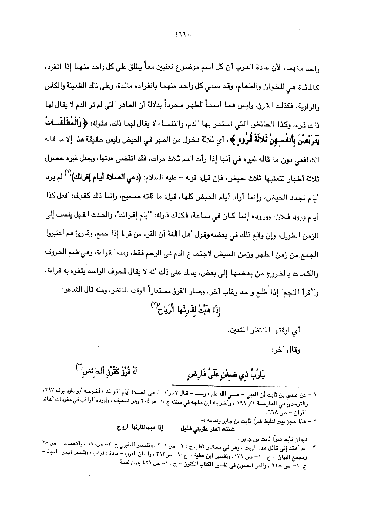فإن قيل: قوله- عليه السلام: (دعي الصلاة أيام إقرائك) لم يرد أيام تجدد الحيض، وإنما أراد أيام الحيض كلها، قيل: ما قلته صحيح، وإنما ذلك كقولك: " فعل كذا أيام ورود فلان، ووروده إنما كان في ساعة، فكذلك قوله: " أيام إقرائك "، والحدث القليل ينسب إلى الزمن الطويل، وإن وقع ذلك في بعضه، وقول أهل اللغة أن القرء من قرءا إذا جمع، وقارئ هم اعتبروا الجمع ومن زمن الطهر وزمن الحيض لاجتماع الدم في الرحم فقط، ومنه القراءة، وهو ضم الحروف والكلمات بالخروج من بعضها إلى بعض، يدلك على ذلك أنه لا يقال للحرف الواحد يتفوه به قراءة، و " أقرأ النجم " إذا طلع واحد وغاب آخر، وصار القرؤ مستعاراً للوقت المنتظر، ومنه قال الشاعر:
